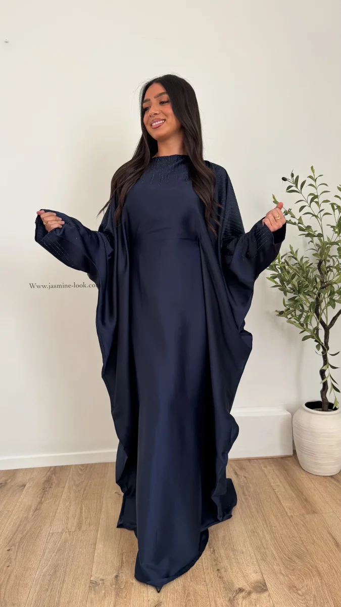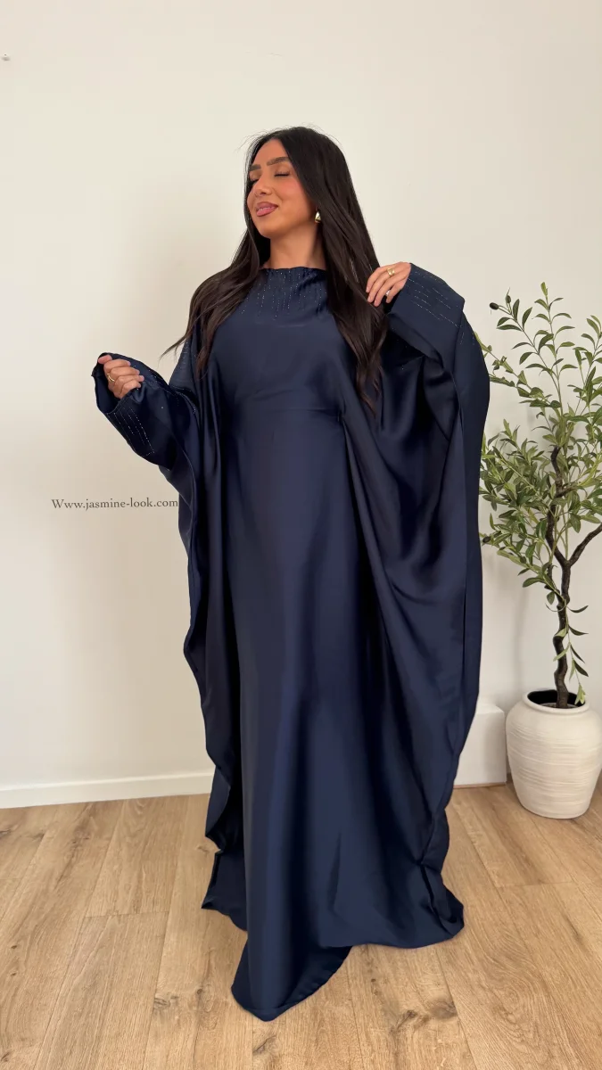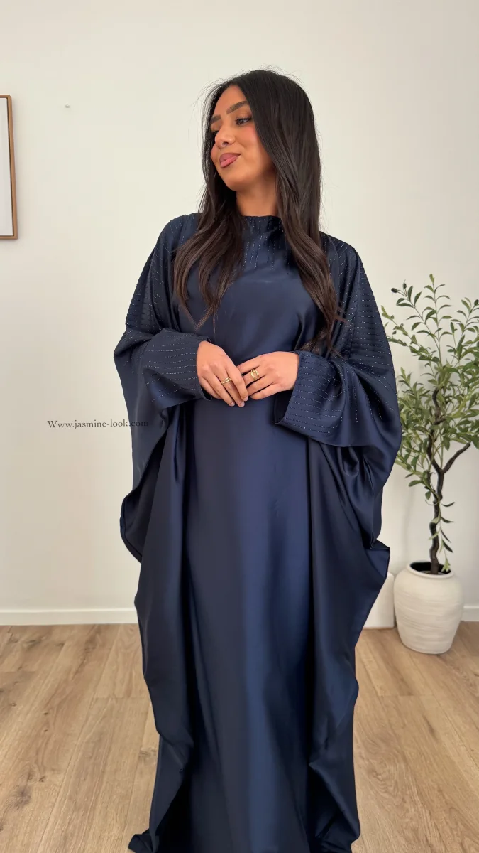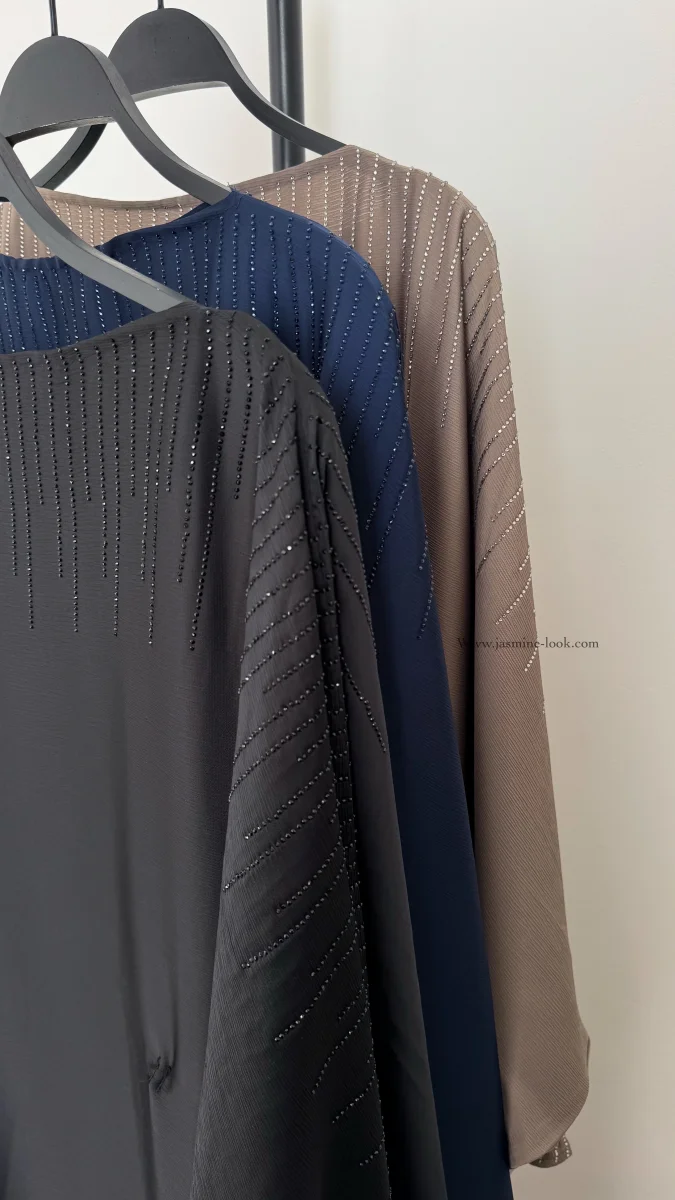 ⚜️Abaya en satin striée avec ceinture intérieure ⚜️Coupe ample avec strass avant et arrière ton sur ton La modèle mesure 1m63