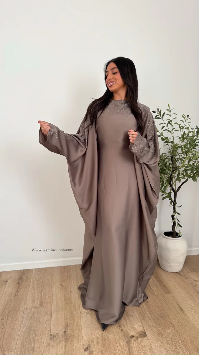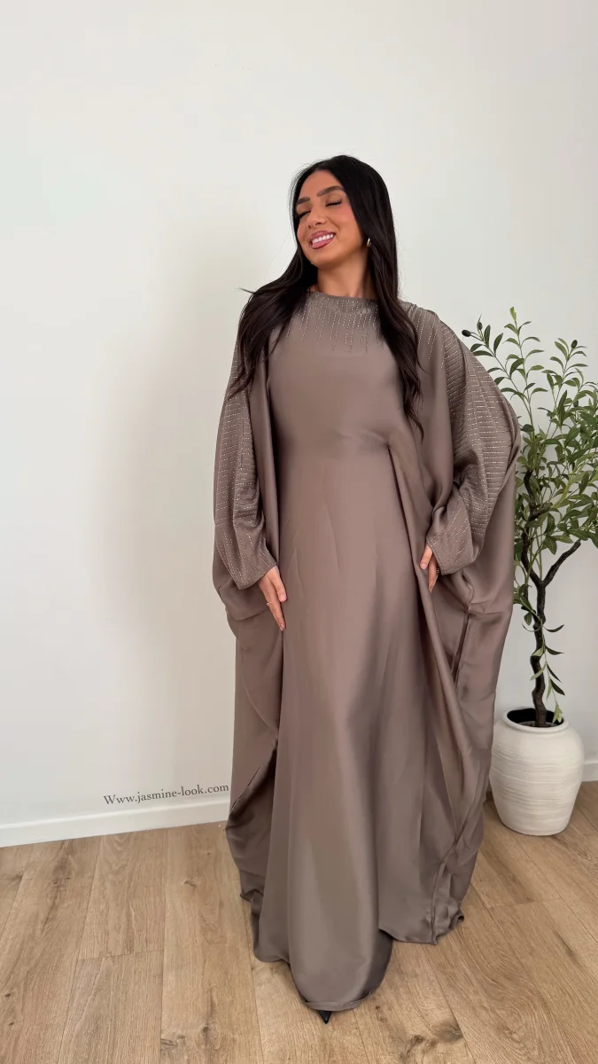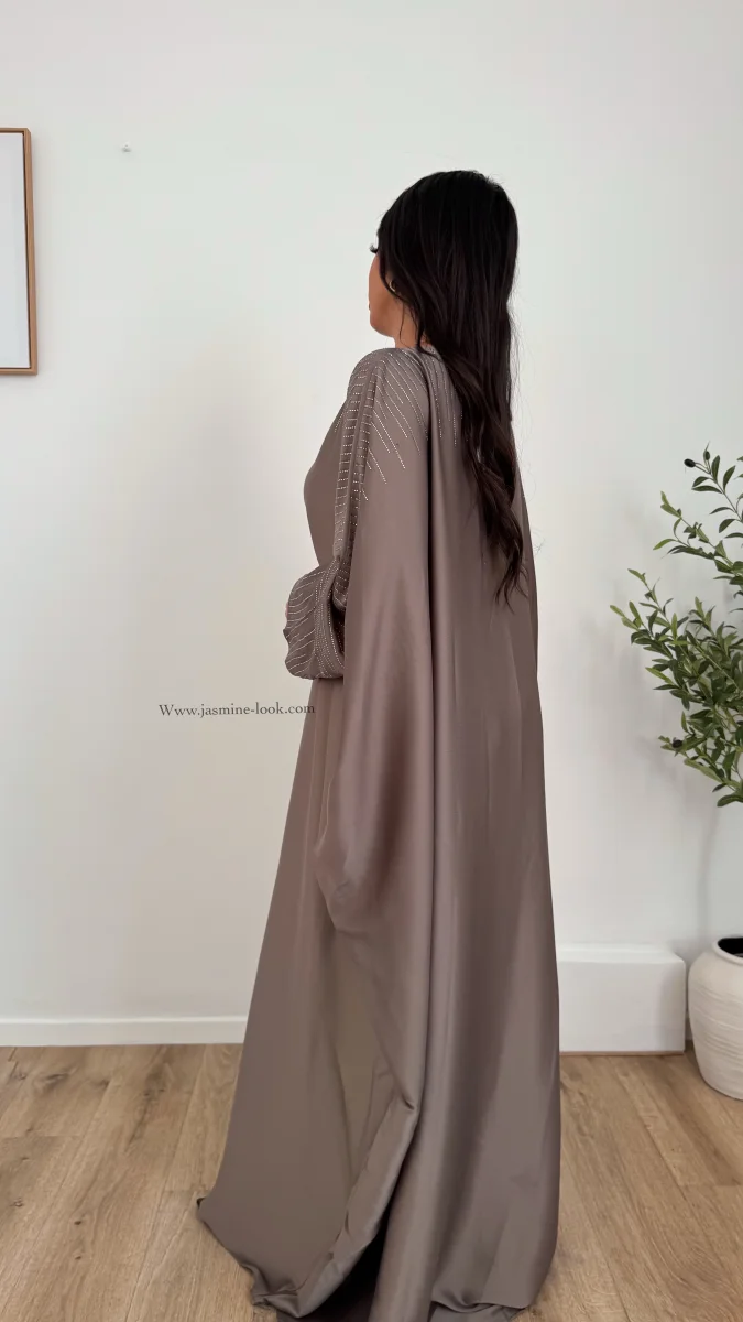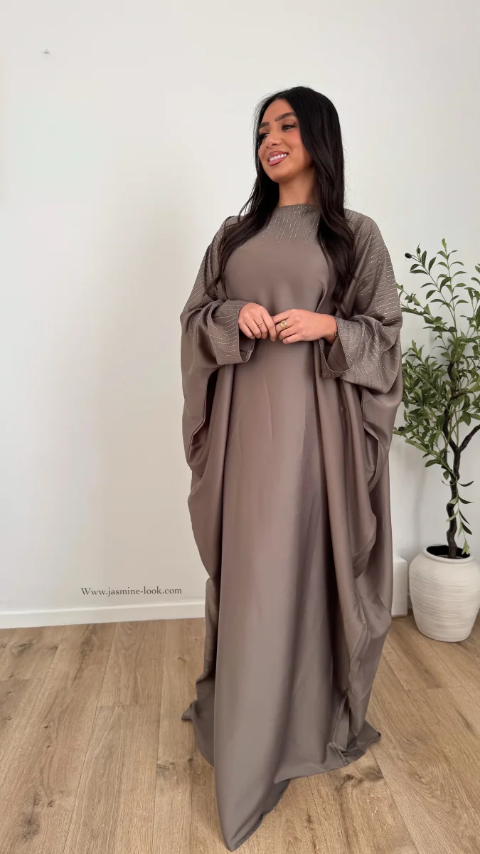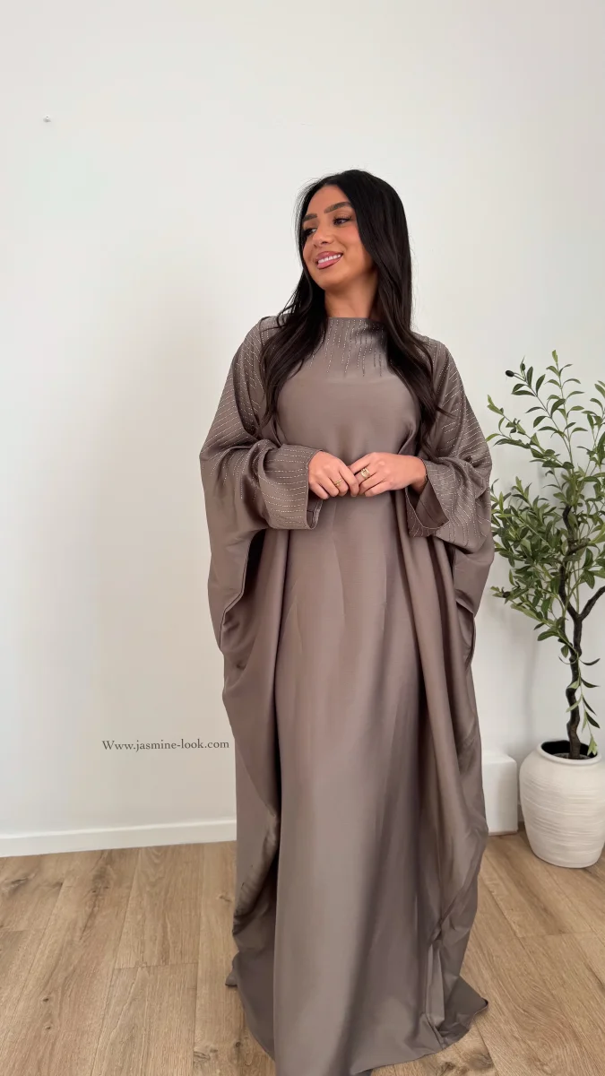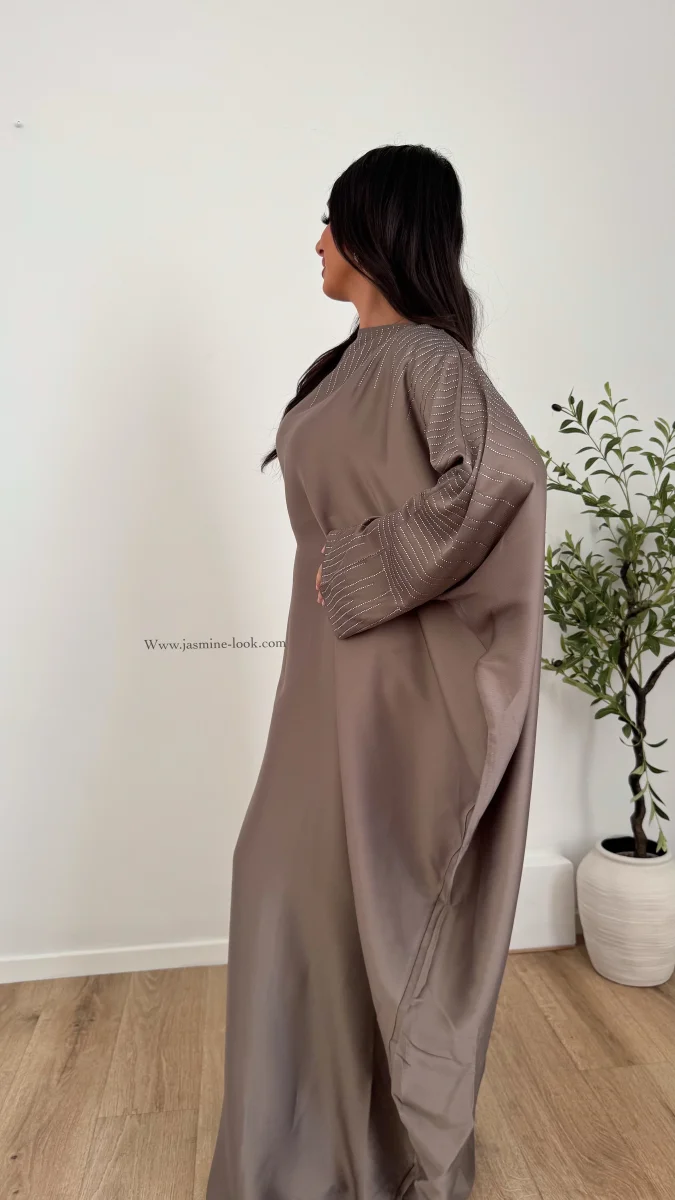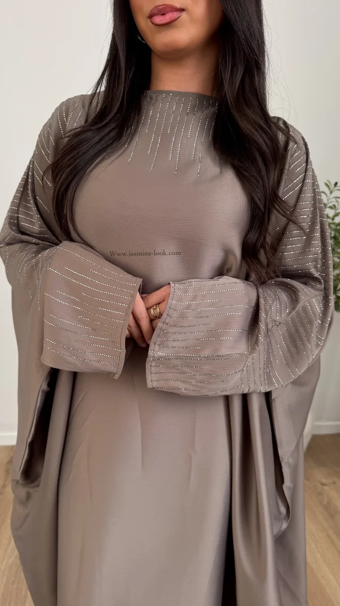 ⚜️Abaya en satin striée avec ceinture intérieure ⚜️Coupe ample avec strass avant et arrière ton sur ton La modèle mesure 1m63