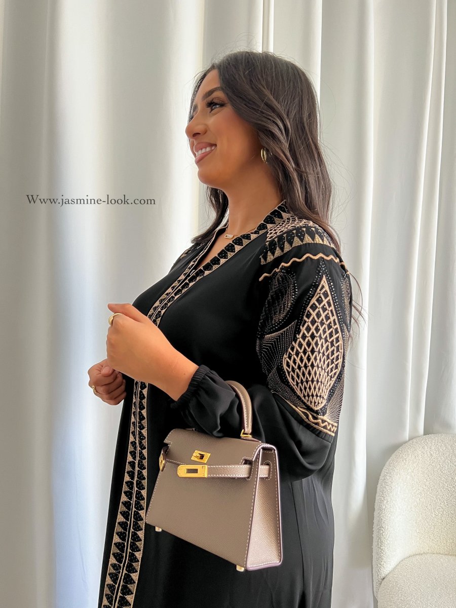 ⚜️Abaya strass et broderie noir sur beige ⚜️Modèle zippé avec ceinture , coupe assez cintrée La modèle mesure 1m64 porte la taille S /36