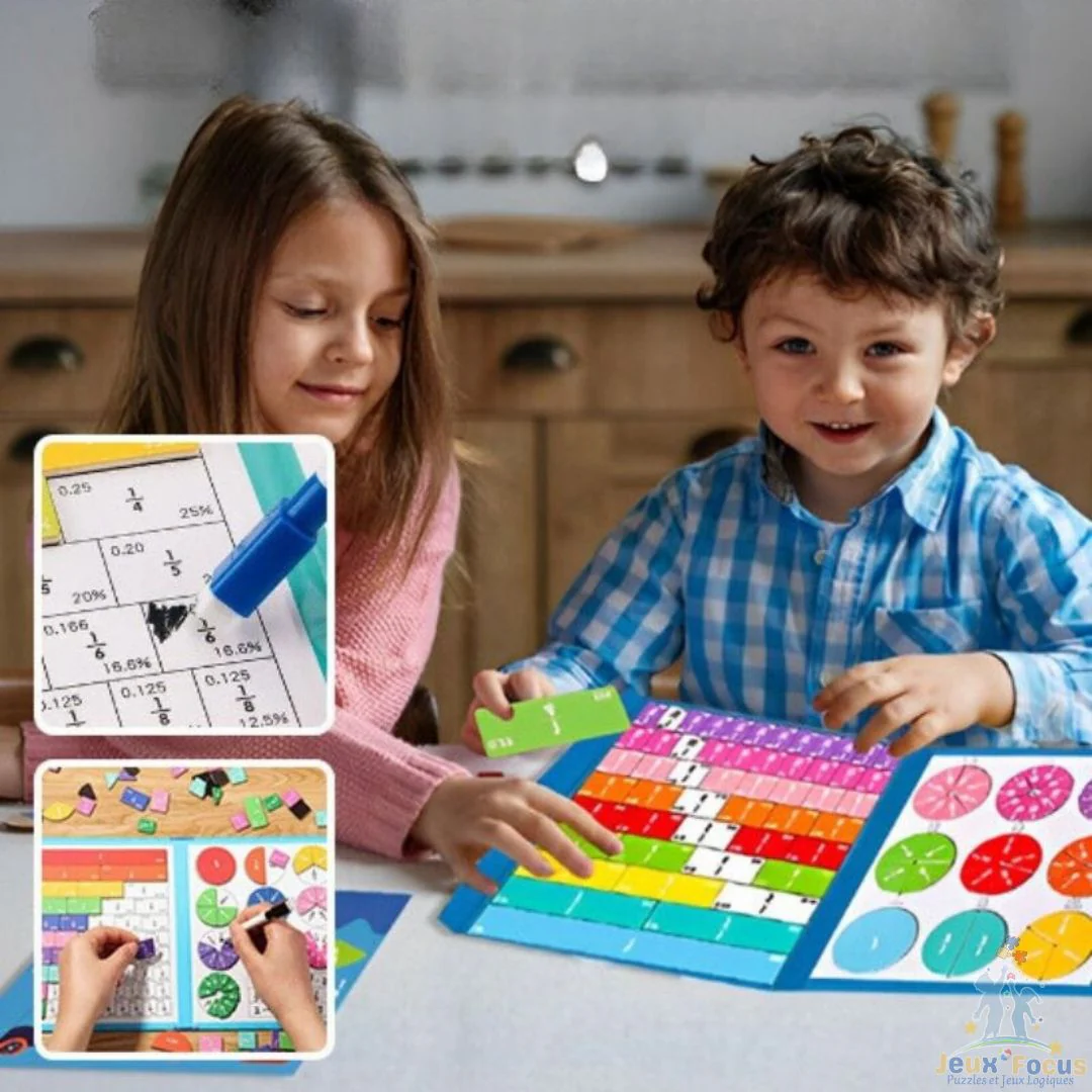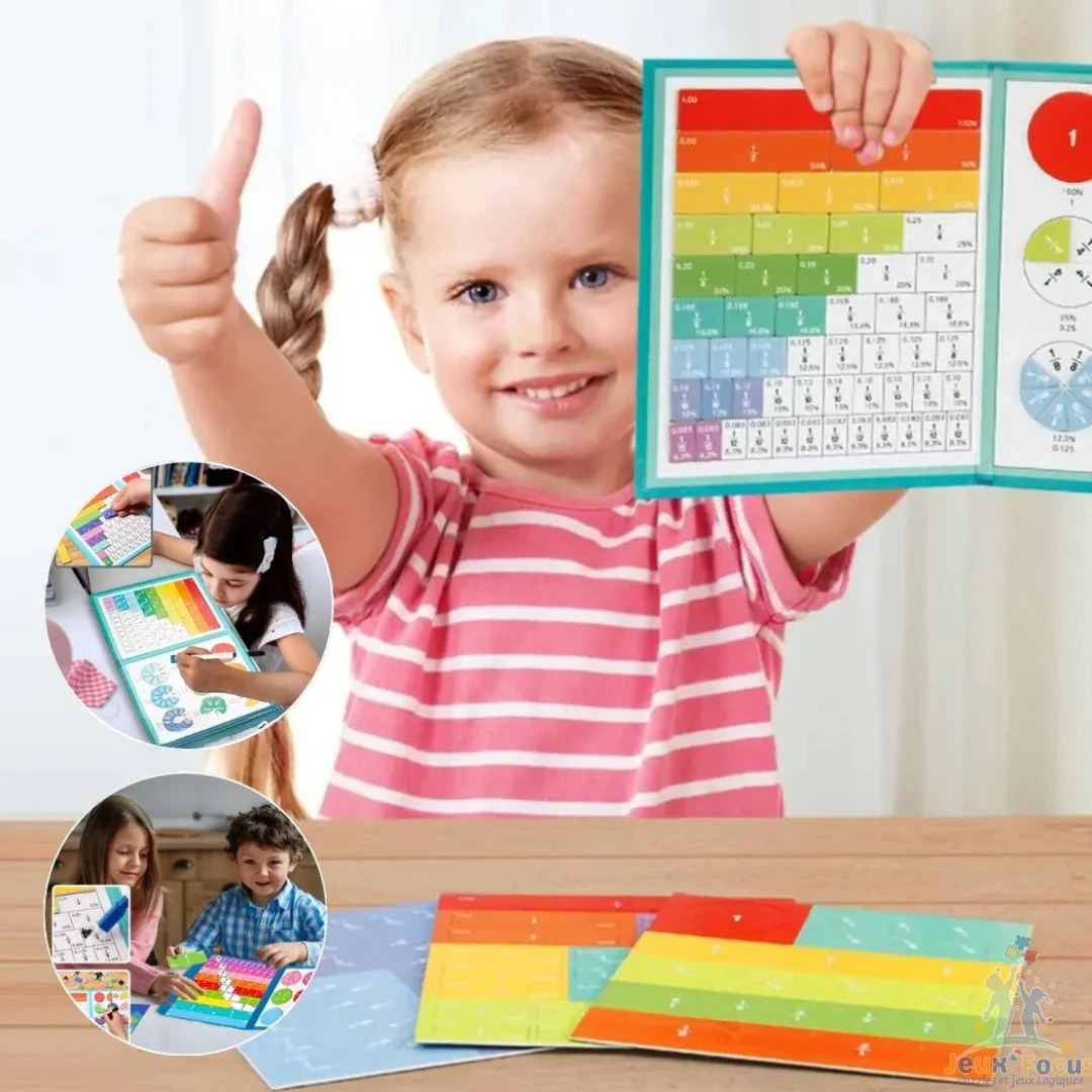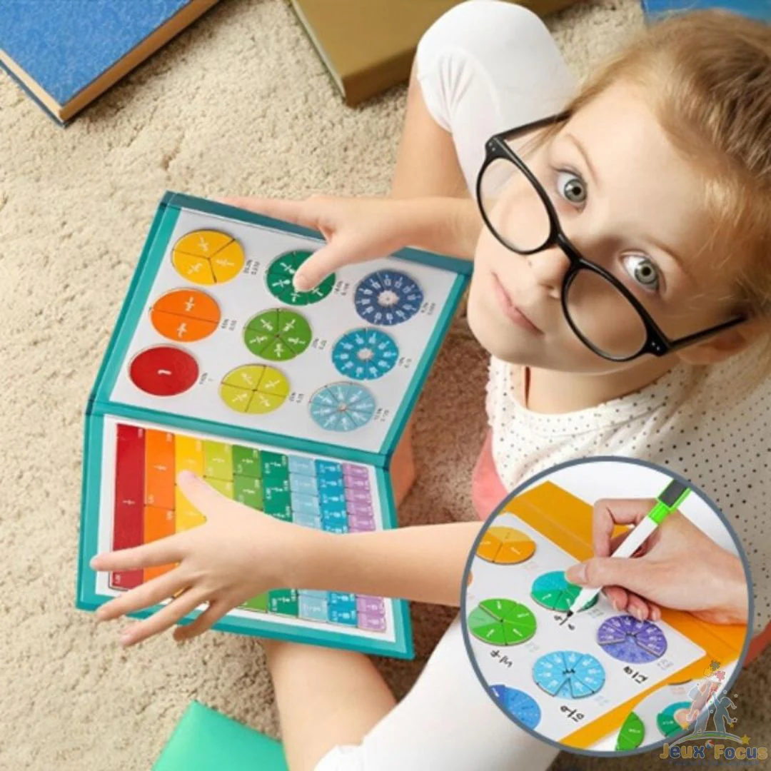 Notre tableau de fractions permet aux enfants de visualiser instantanément les concepts mathématiques complexes. L’aide au devoir efficace passe par la manipulation de l’enfant. Il a besoin de toucher et organiser.