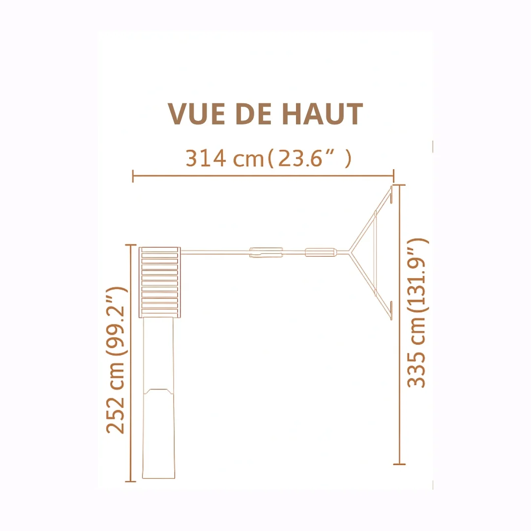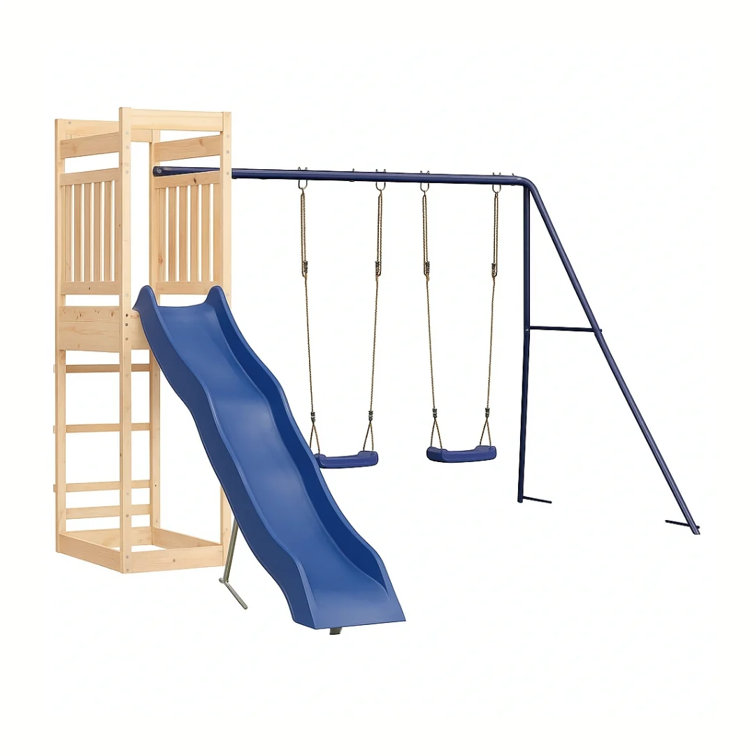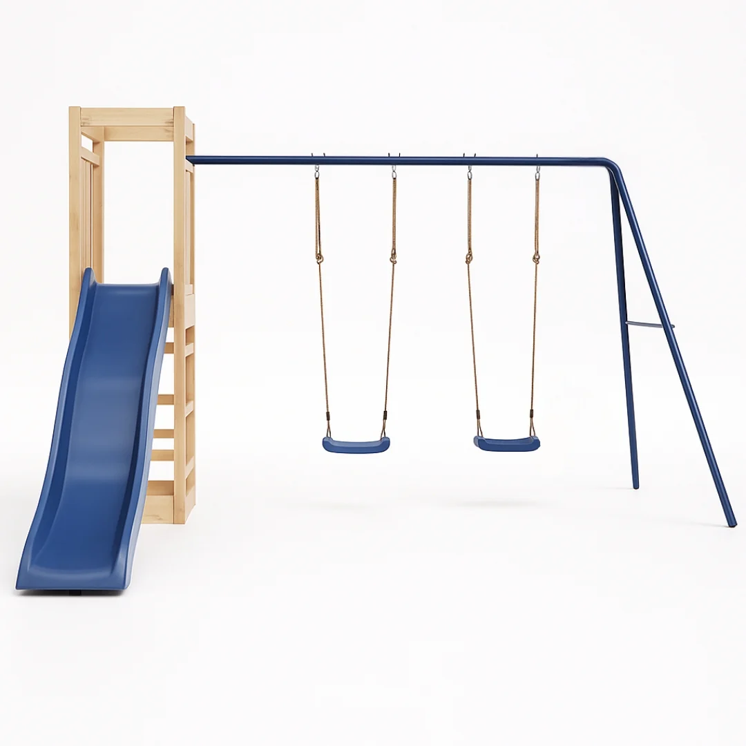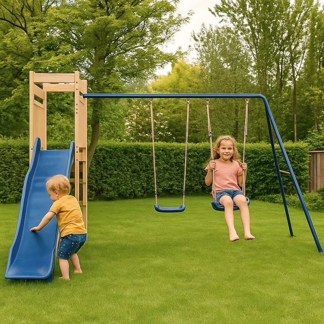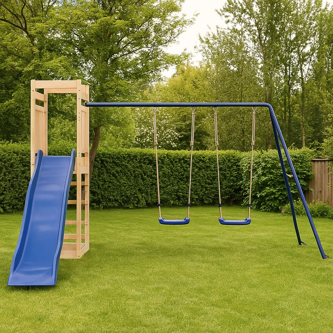 Un espace de jeu Montessori extérieur, conçu pour le bonheur des enfants et la sérénité des parents.Cette structure complète avec échelle d’escalade, balançoire double et toboggan ondulé transforme votre jardin en terrain d’aventure.Son design épuré en bois de pin naturel et accents bleu profond s’intègre parfaitement dans un extérieur familial moderne.