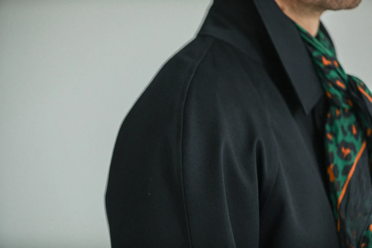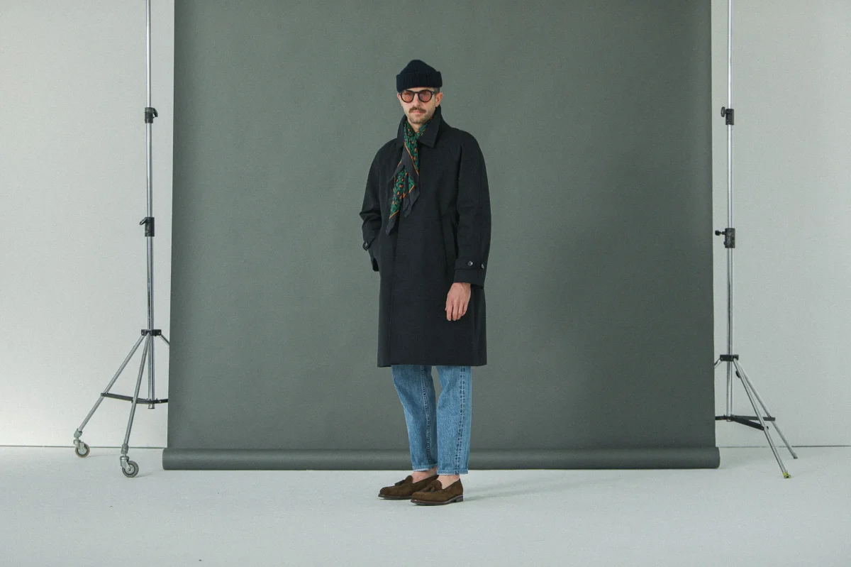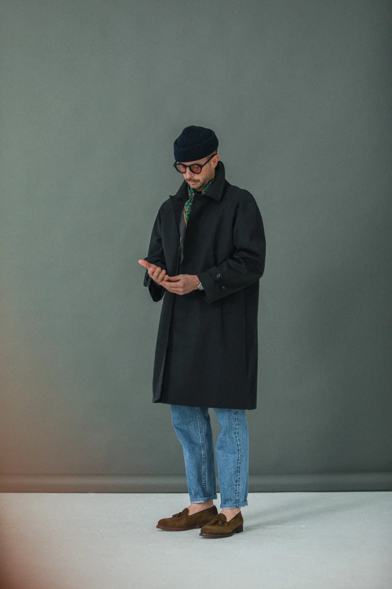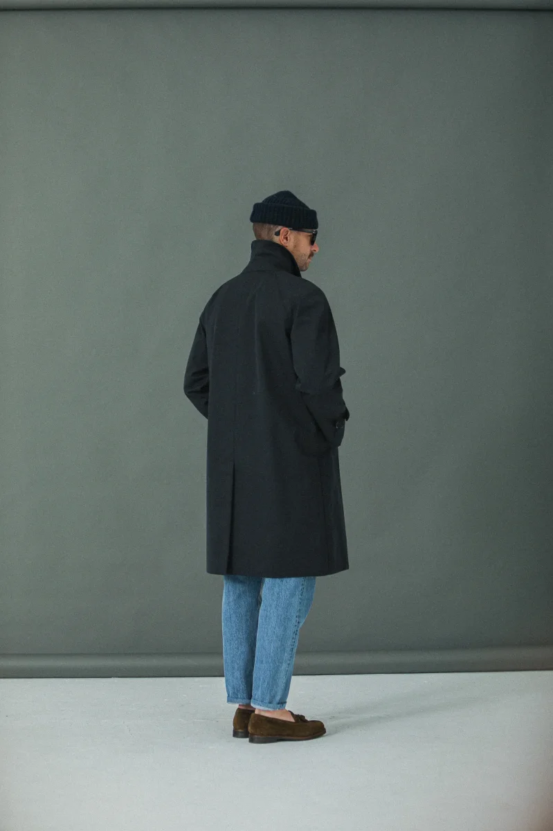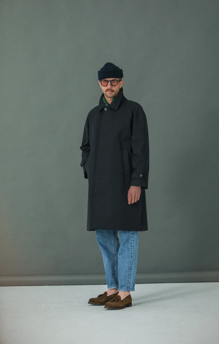 Introduction cette saison d’une déclinaison imperméable de notre balmaccan en laine et cachemire. Notre hommage à une pièce iconique du vestiaire masculin, le Balmaccan, premier manteau contemporain. Nouveau patronnage et nouvel atelier partenaire, plus long et plus confortable et désormais disponible dans un magnifique tissu technique italien imperméable. Ce manteau à manches raglan, très confortable et très versatile est un véritable classique du vestiaire masculin dont l’allure particulièrement moderne résonne avec les silhouettes contemporaines que nous apprécions.