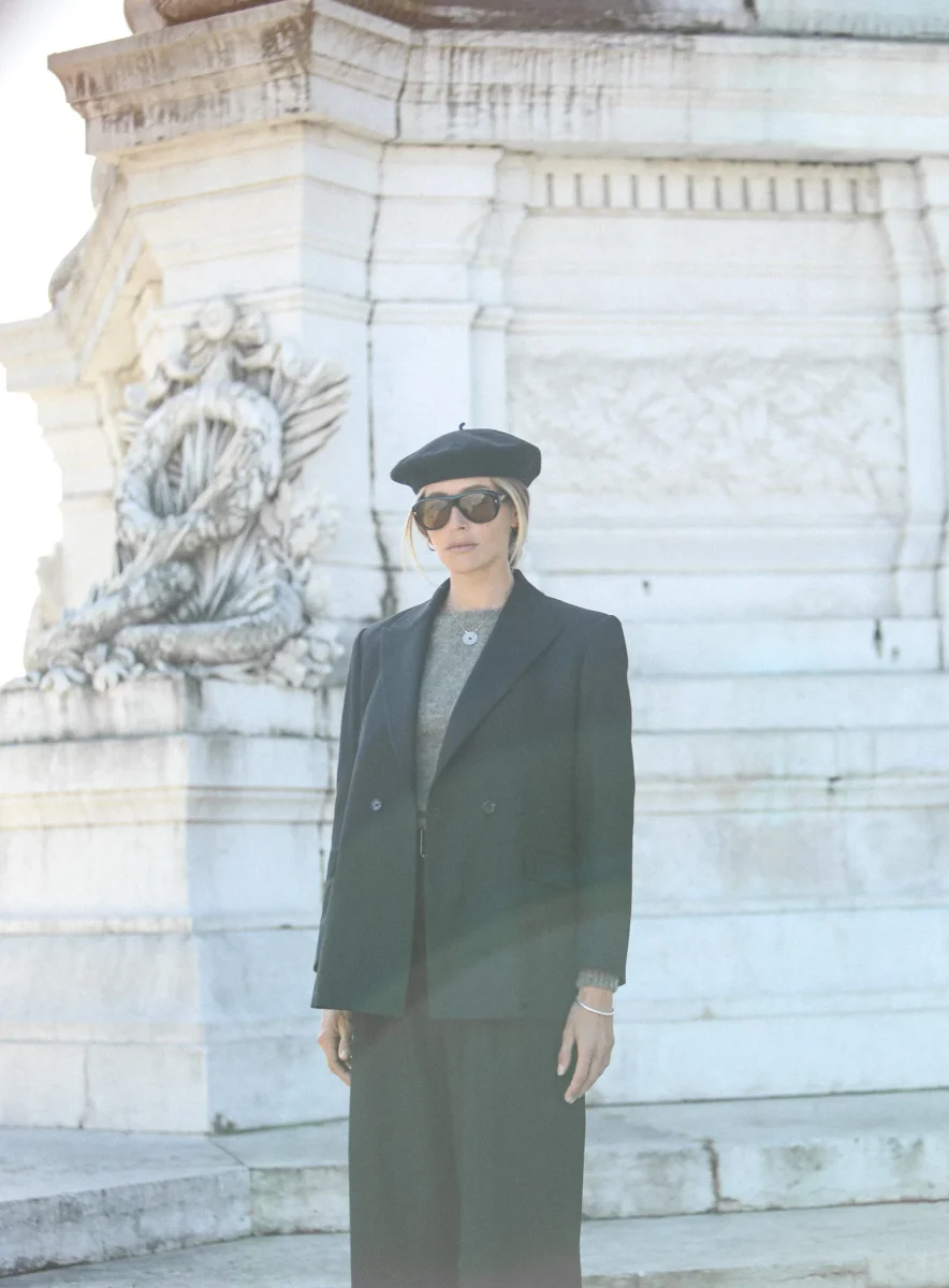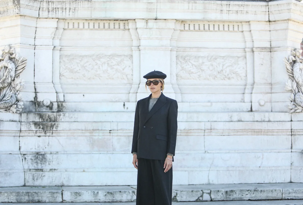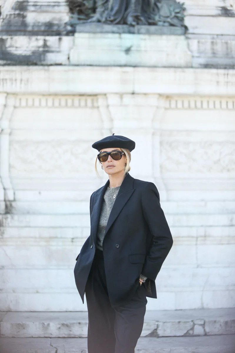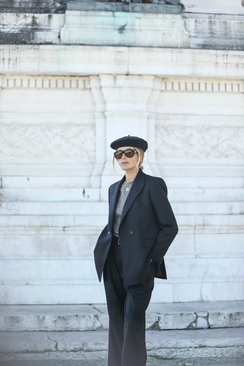 Veste de blazer croisée confectionnée dans une très belle flanelle de laine noire. La coupe est confortable et légèrement oversize. La veste se ferme par un boutonnage simple. Cette veste peut être porté avec la pantalon assorti à double pince pour constituer un costume.