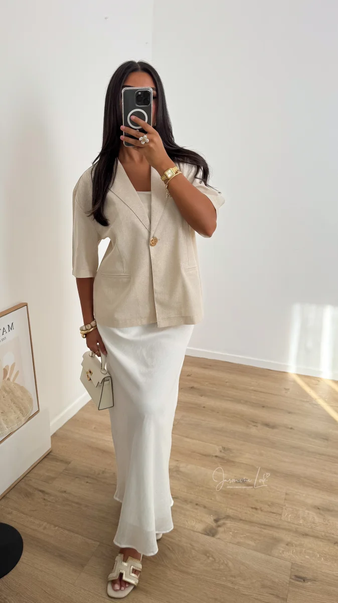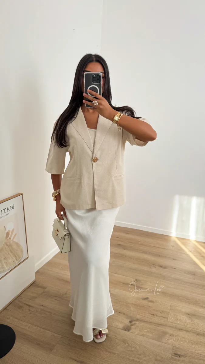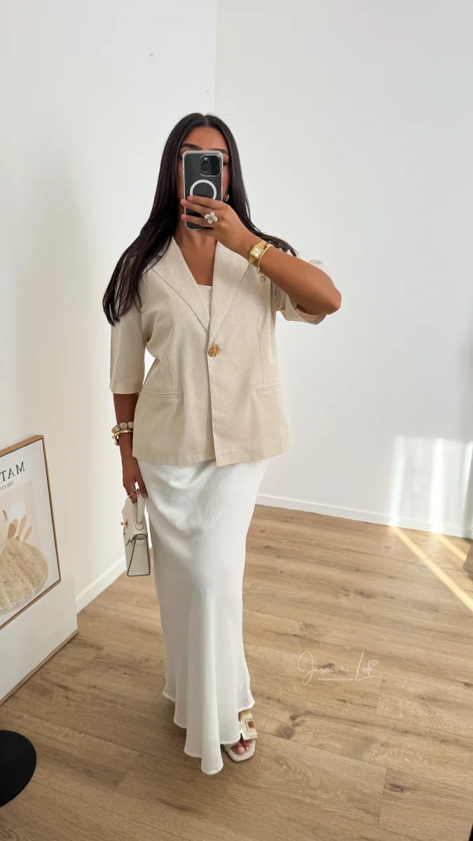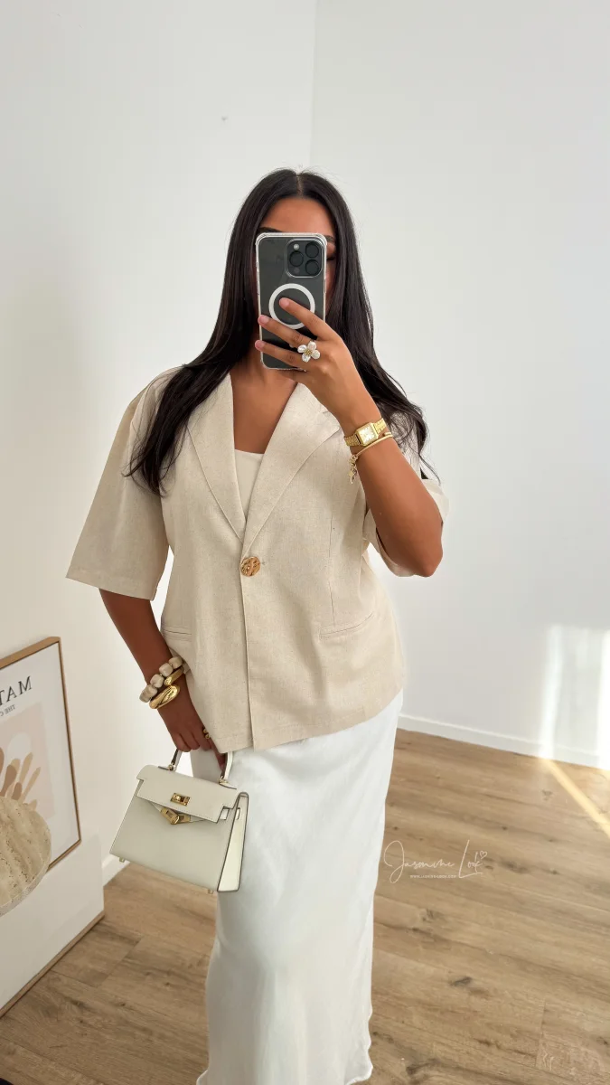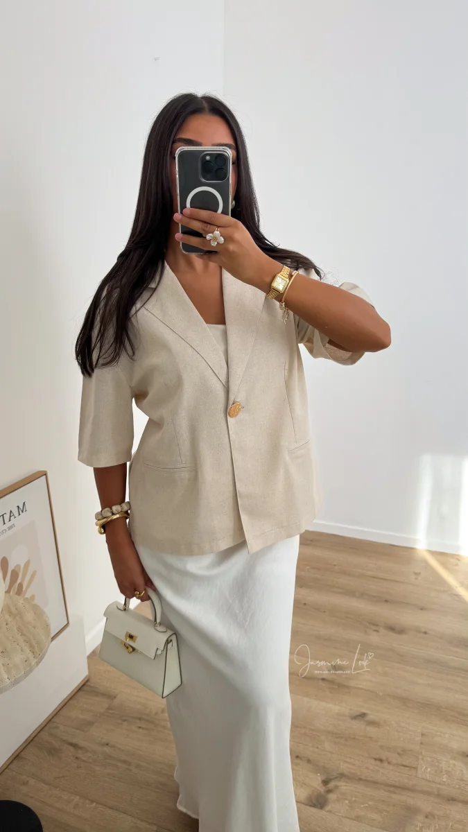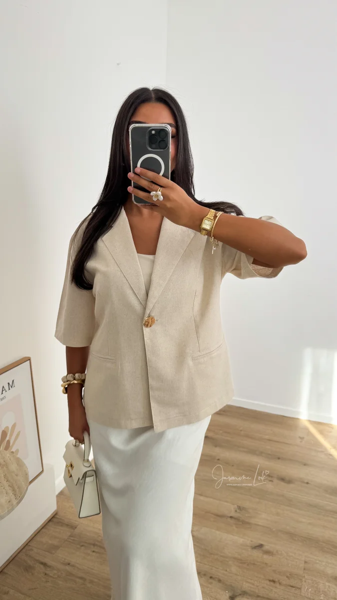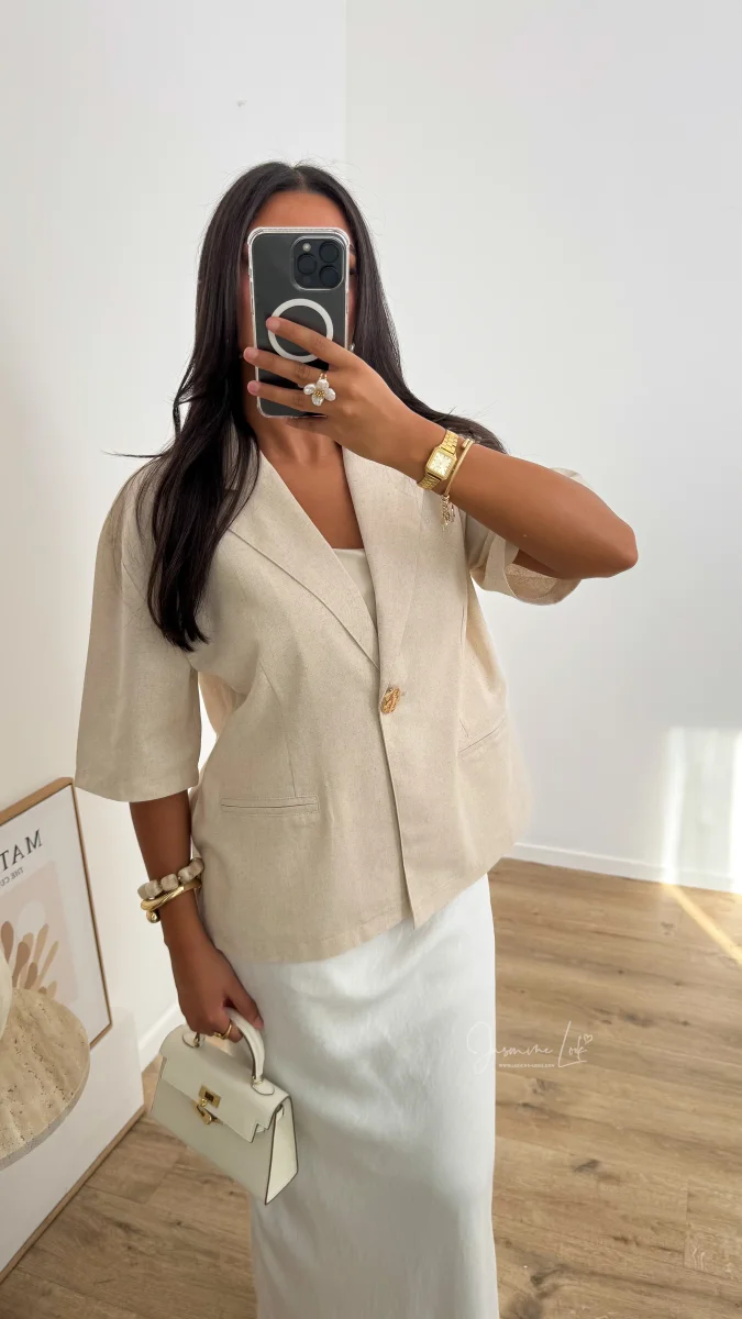 ⚜️Blazer en lin manche courte bouton bijou ⚜️Coupe ample , taille parfaitement . La modèle mesure 1m63 et porte la taille SM