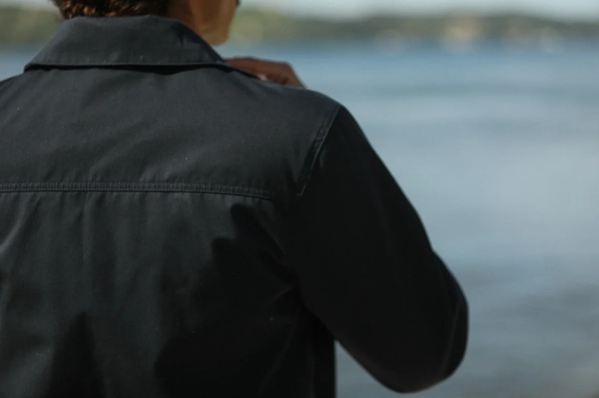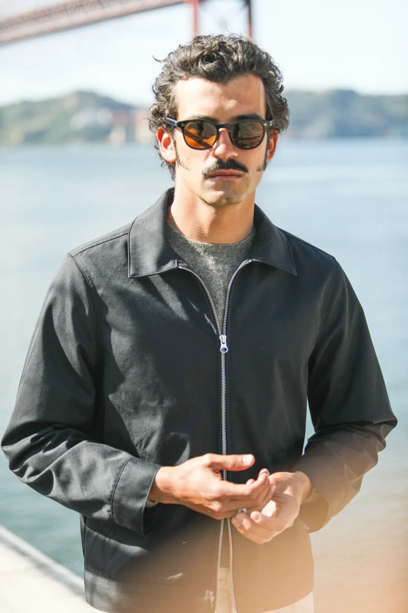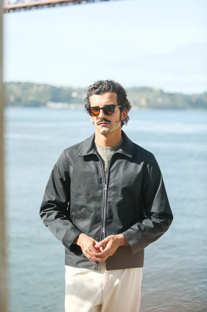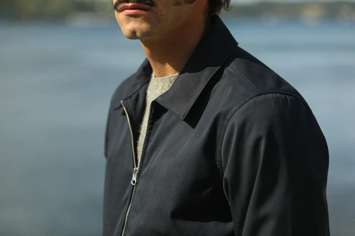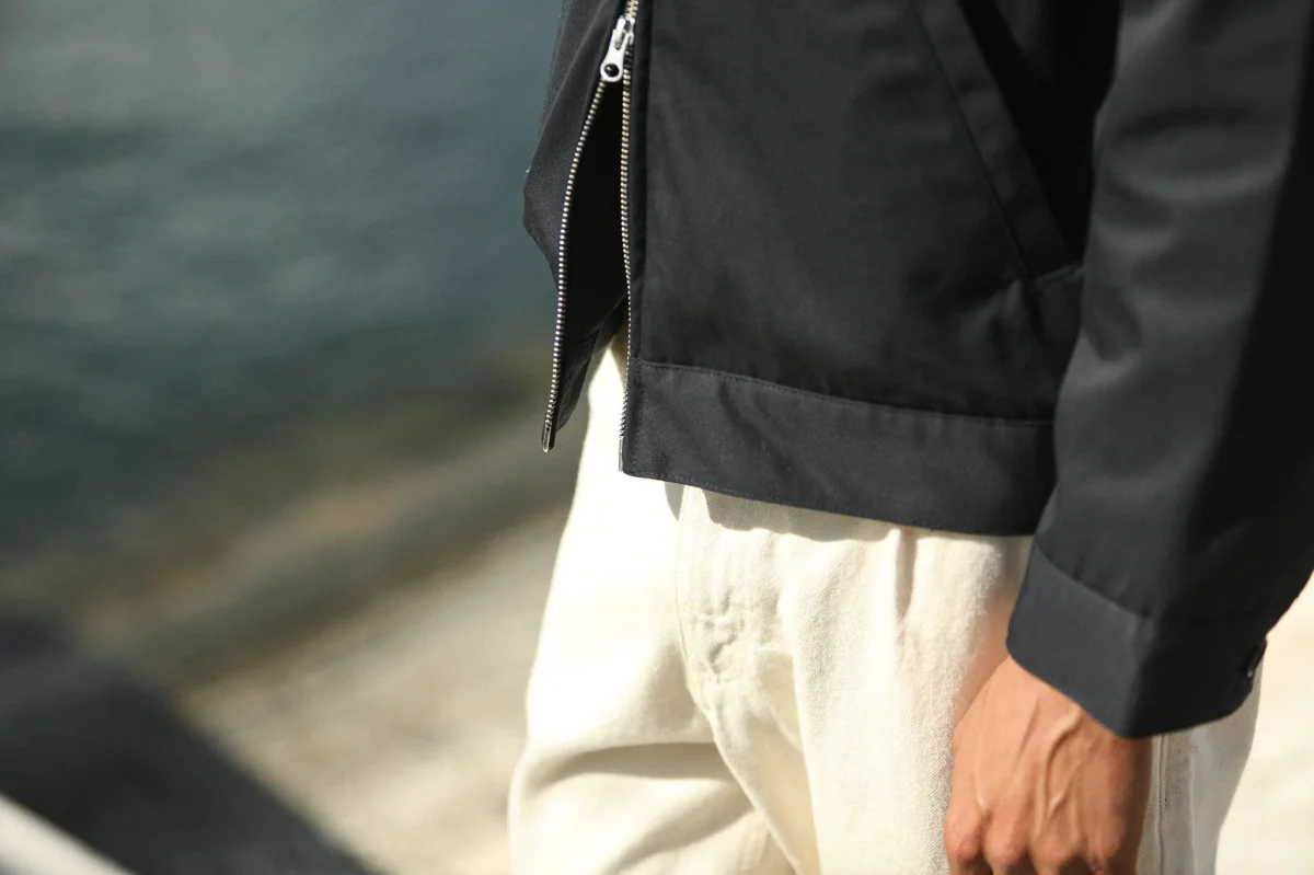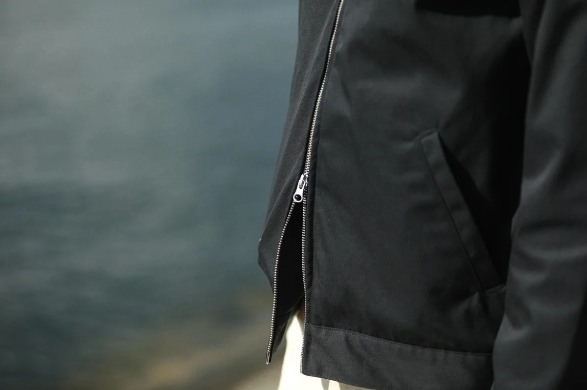 Veste imperméable à fermeture éclair avec double curseur. Basé sur le bloc de notre veste laine et cachemire, nous déclinons cette saison ce modèle dans un tissu mélangé coton-poly, imperméable car dotée d’une membrane. Le col simple termine cette pièce que nous sommes ravis d’introduire dans notre proposition