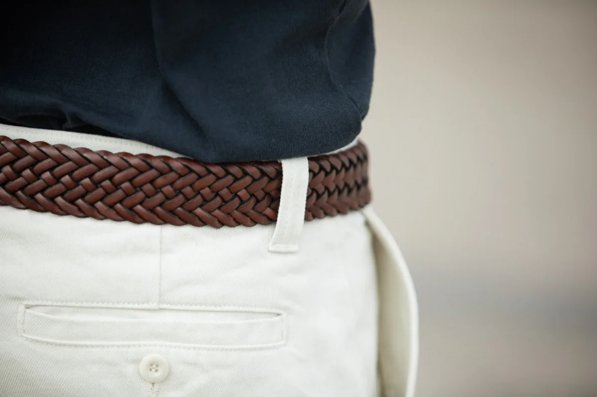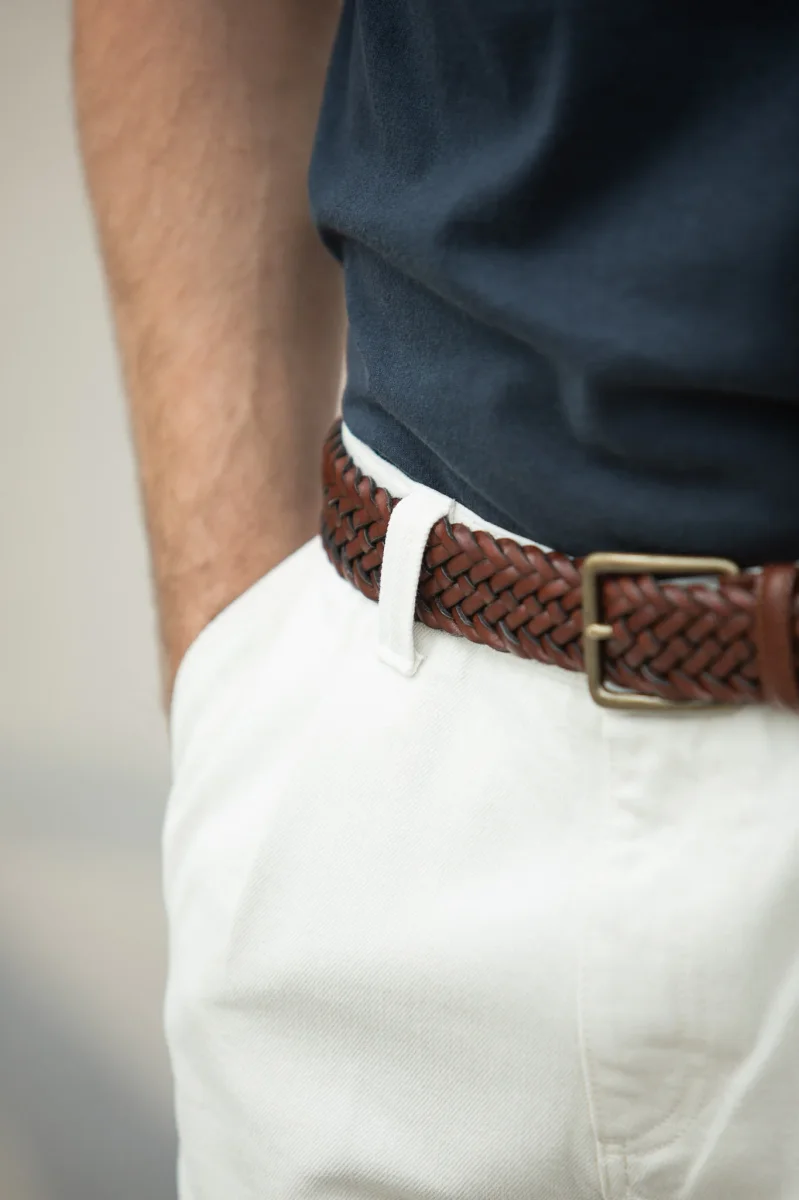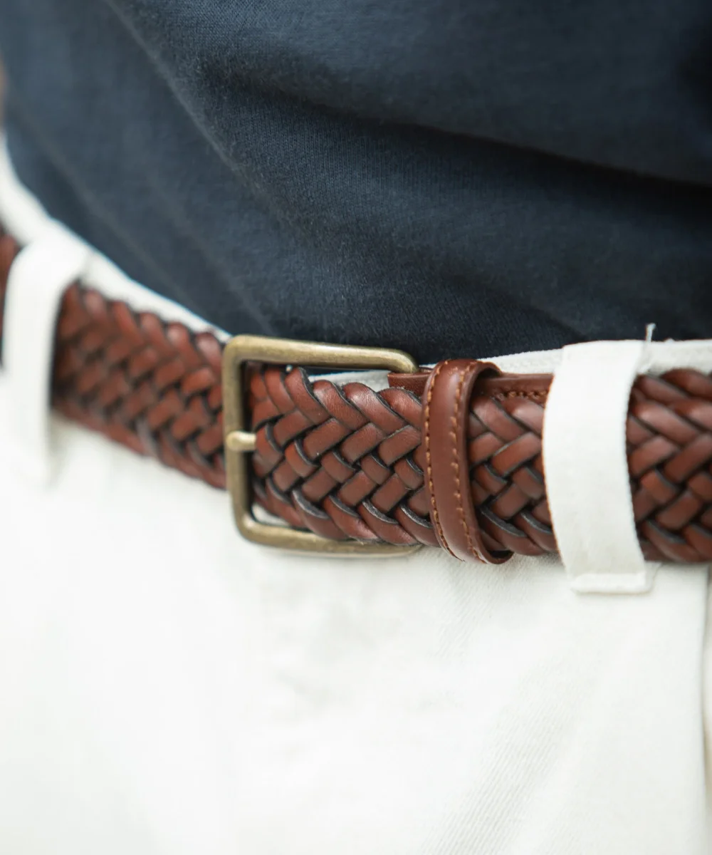 Ceinture en cuir tressée que nous avons développée pour ponctuer nos silhouettes de manière élégante. Tressée et assemblée à la main au Portugal, elle vous accompagnera pour de nombreuses années et acquerra une très belle patine au fil des ports.