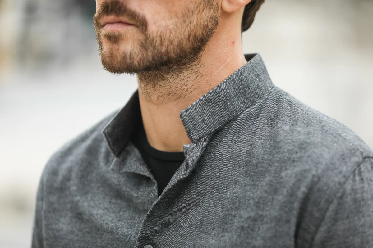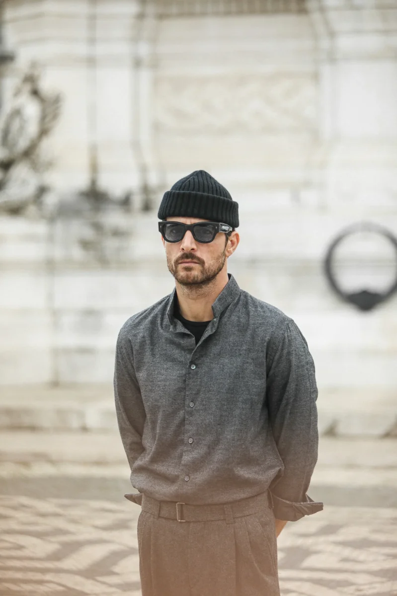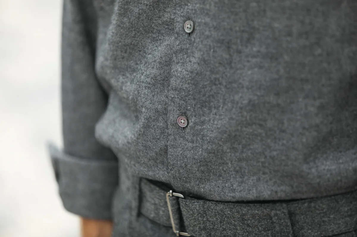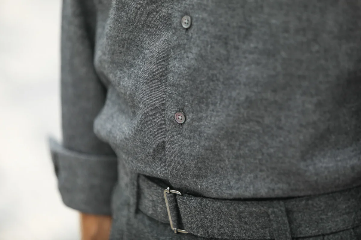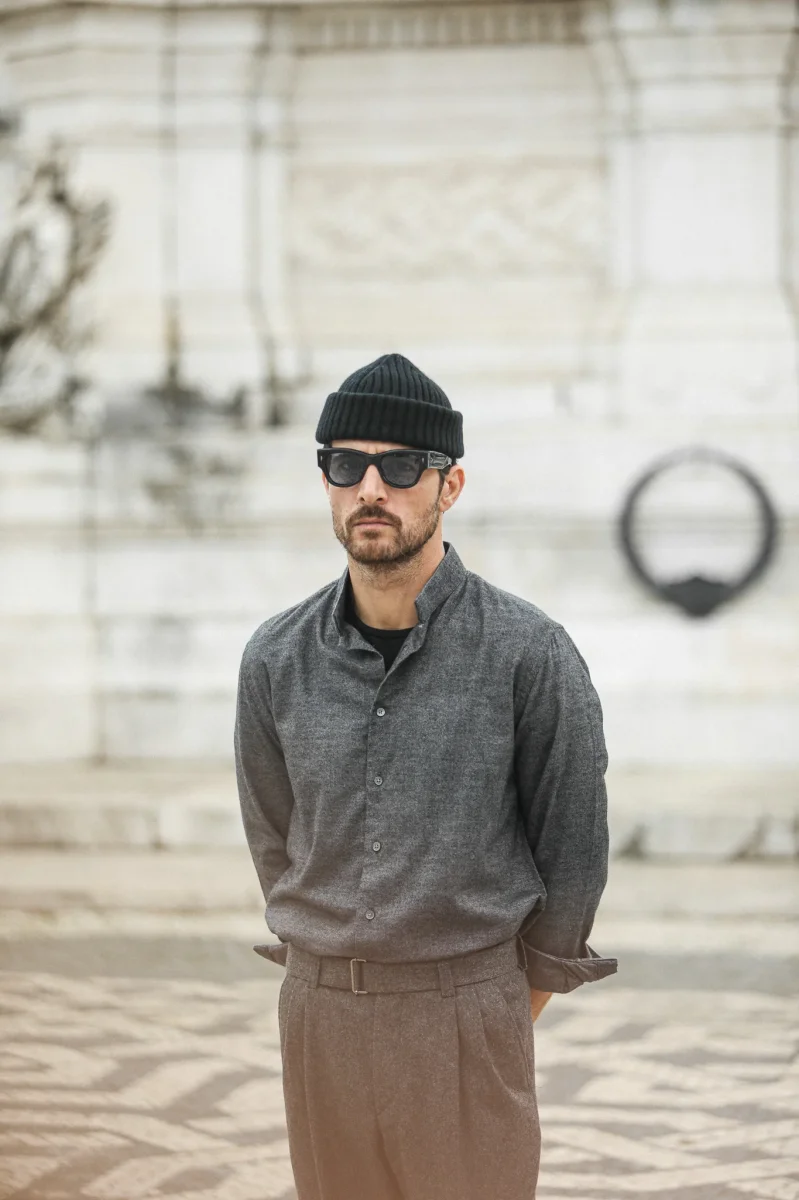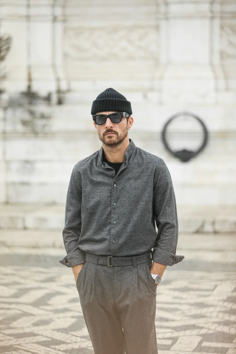 De retour cette saison, notre chemise à col tailleur à l’allure particulièrement élégante, inspiré du vestiaire tailleur, se décline en version hiver dans une très belle flanelle gris chiné.