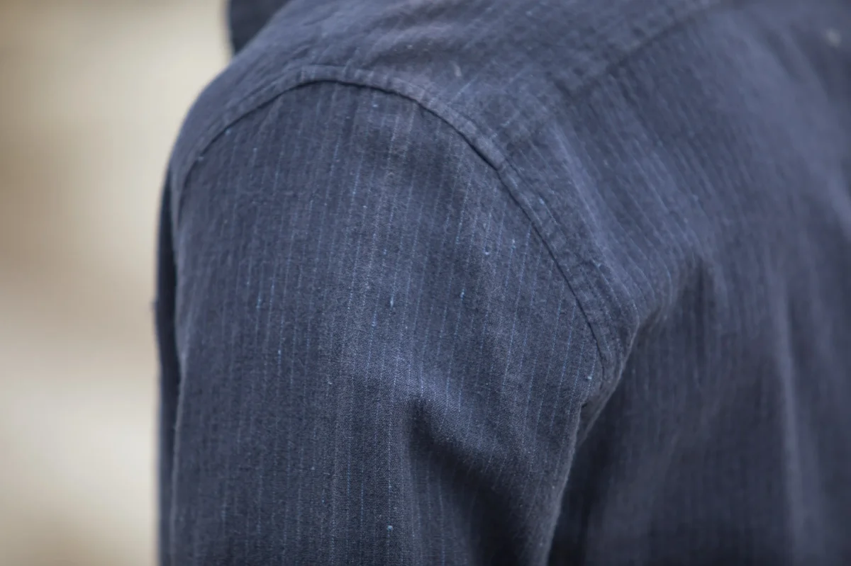 Chemise confectionnée dans un tissu Japonais. Le tissage réalisé par une filature japonaise d’exception présente de légères irrégularités et rappelle l’aspect visuel et la main des tissus anciens que nous apprécions particulièrement.