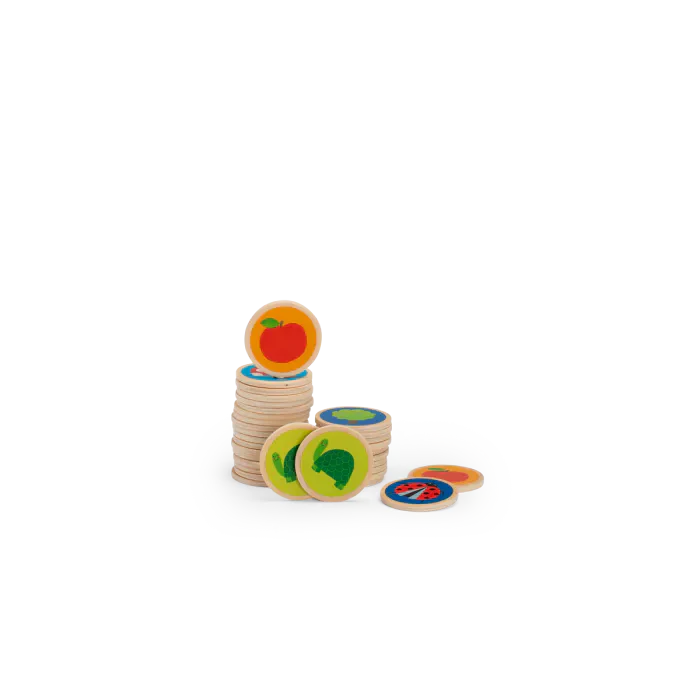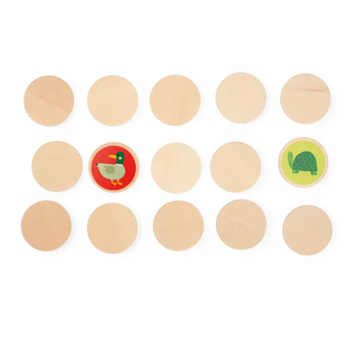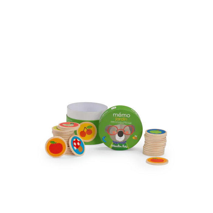 Mémo en bois sur le thème du jardin. Posez les cartes rondes face cachée, retournez-en 2. Si elles sont identiques, gardez-les. Sinon, replacez-les. Souvenez-vous des emplacements pour former des paires. Gagnez en remportant le plus de paires.