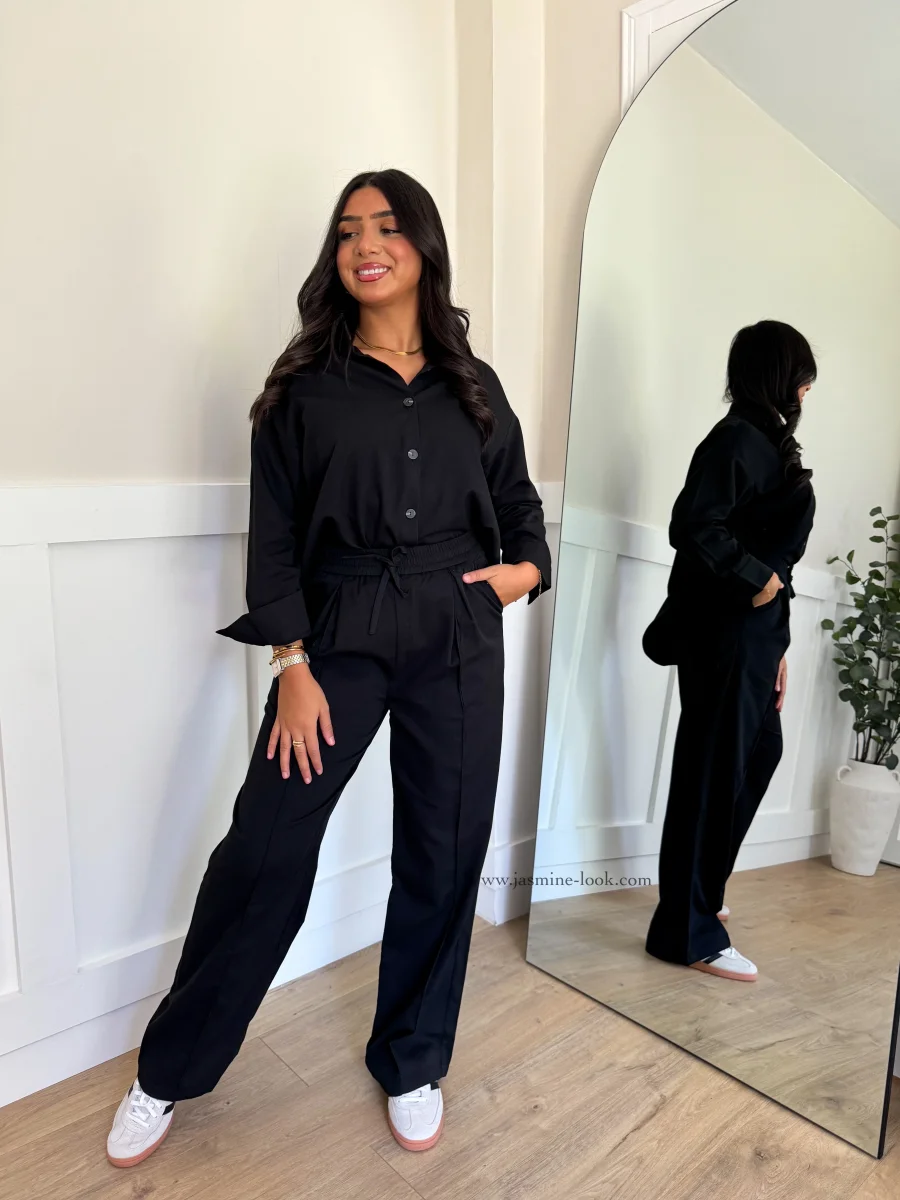 Cet ensemble intemporel allie élégance et praticité ! Composé d’une chemise mi-longue et d’un pantalon style tailleur, il vous assure un look soigné en toutes circonstances. La taille élastique offre un confort optimal et les pièces peuvent également être portées séparément.
