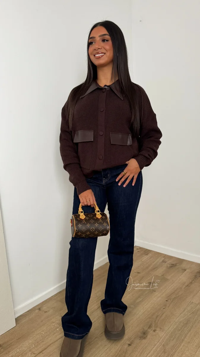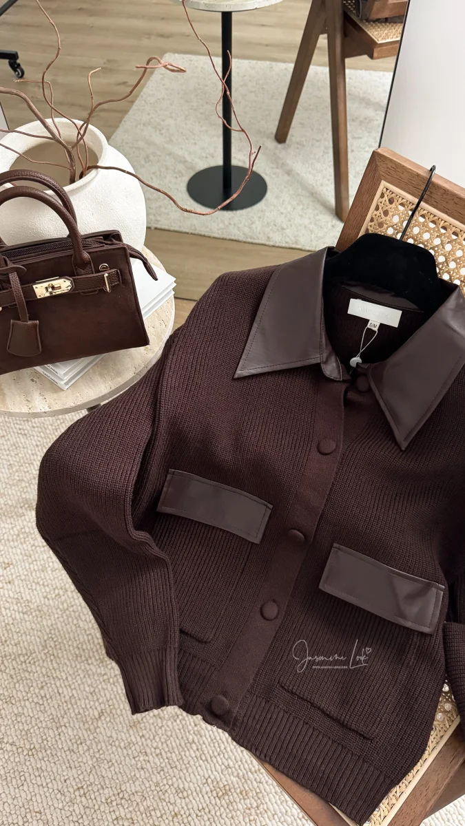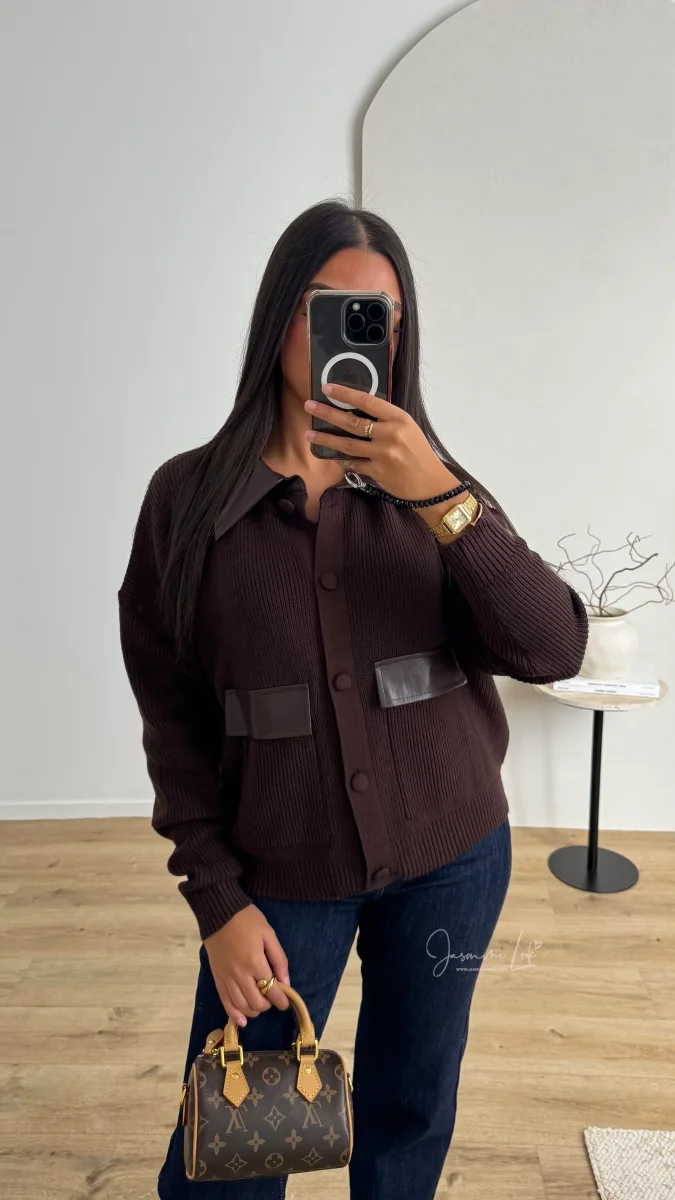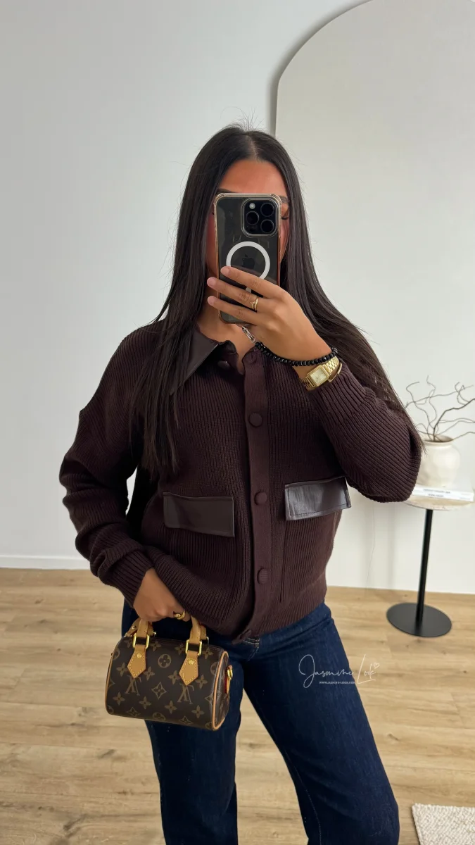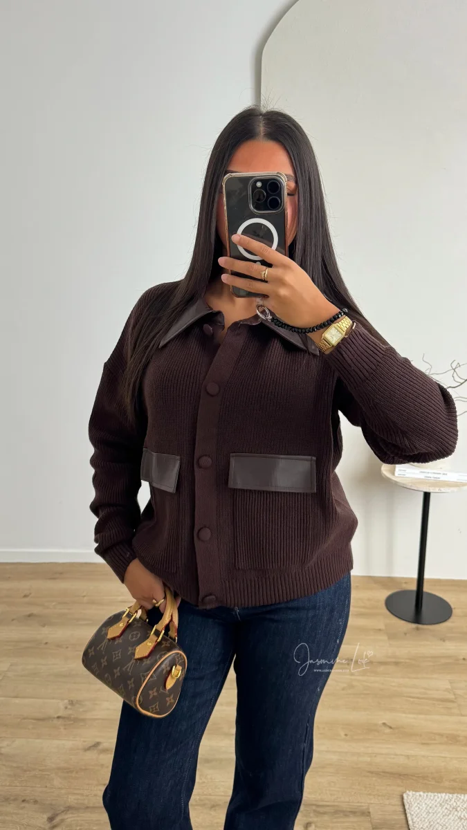 Gilet maille côtelé avec col similicuir Taille parfaitement . La modèle mesure 1m63 Porte la taille SM