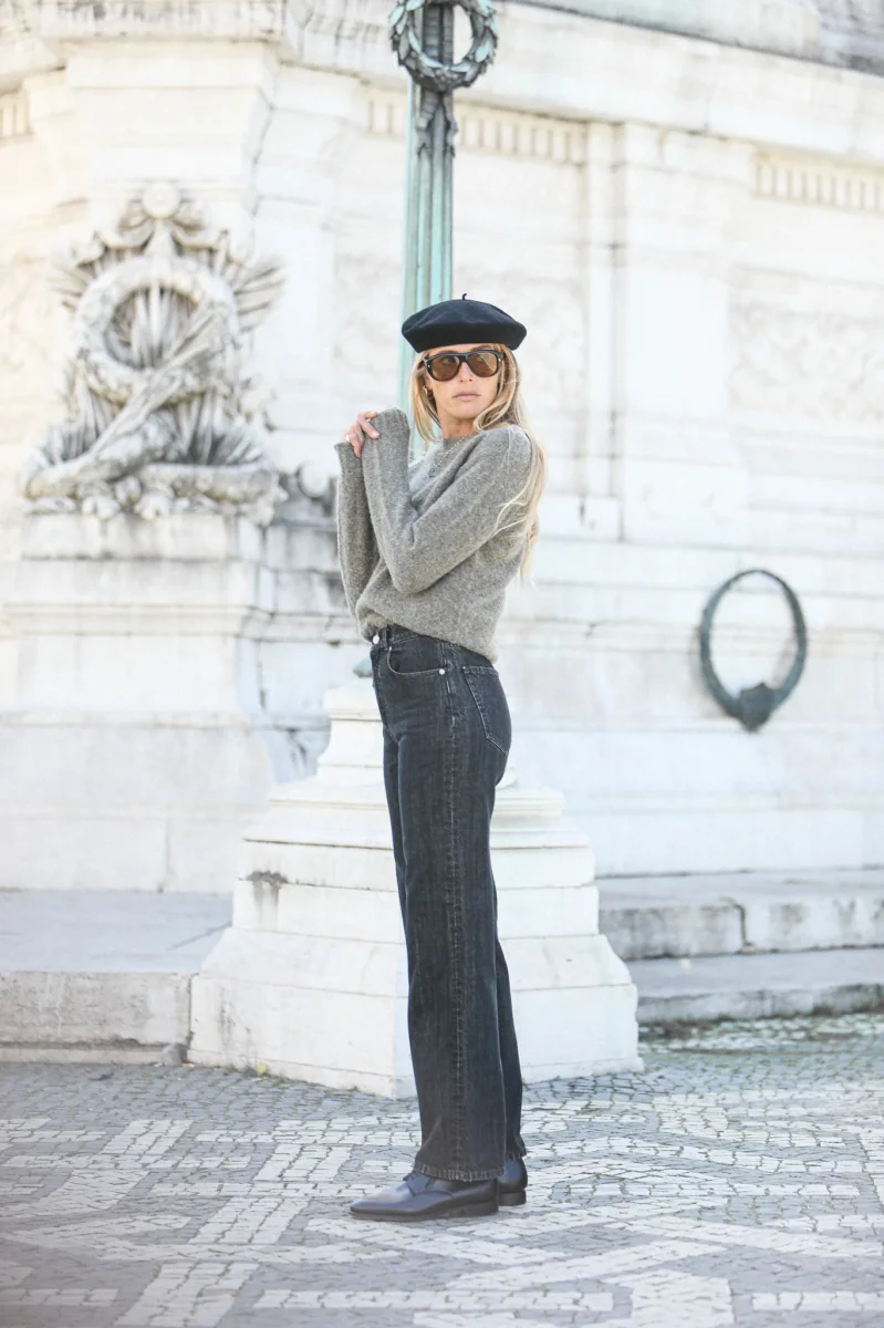 Jean taille haute et « wide leg » en denim japonais noir. La coupe est confortable. Le lavage est de type stonewash.