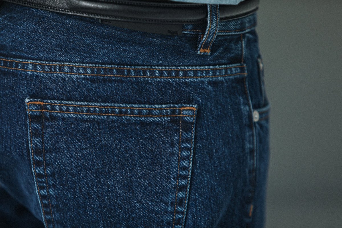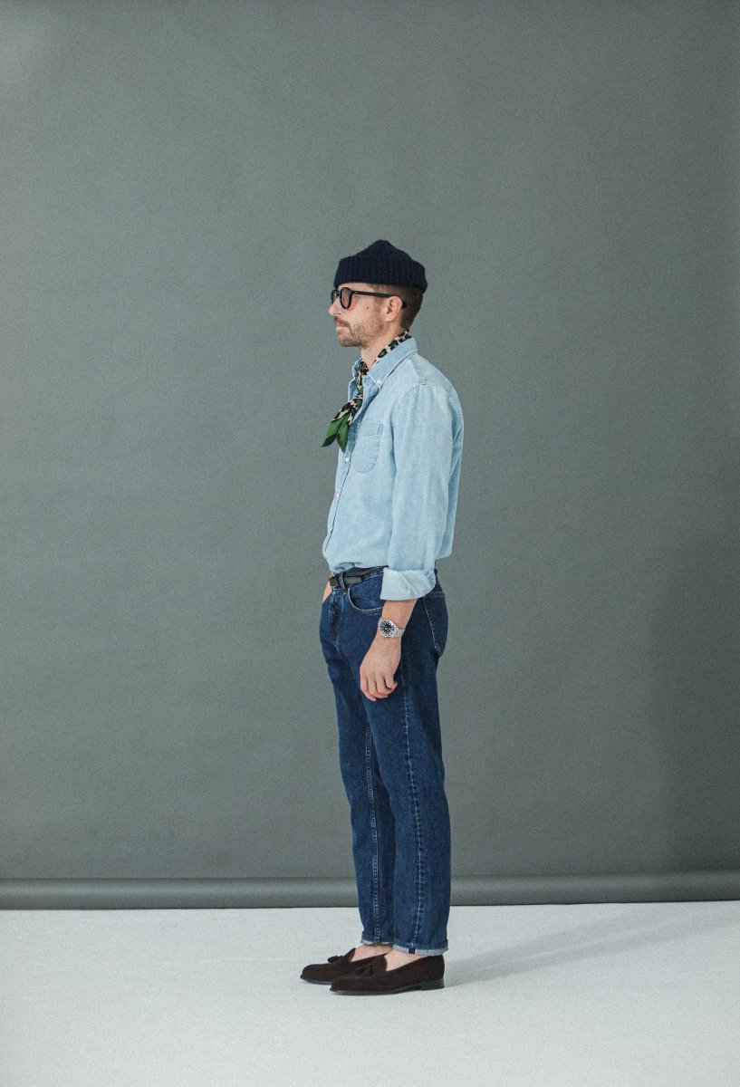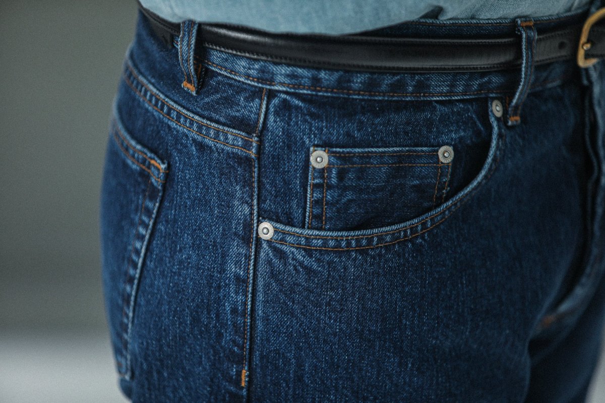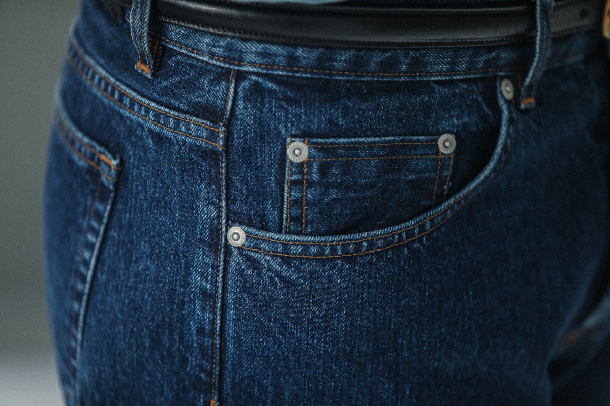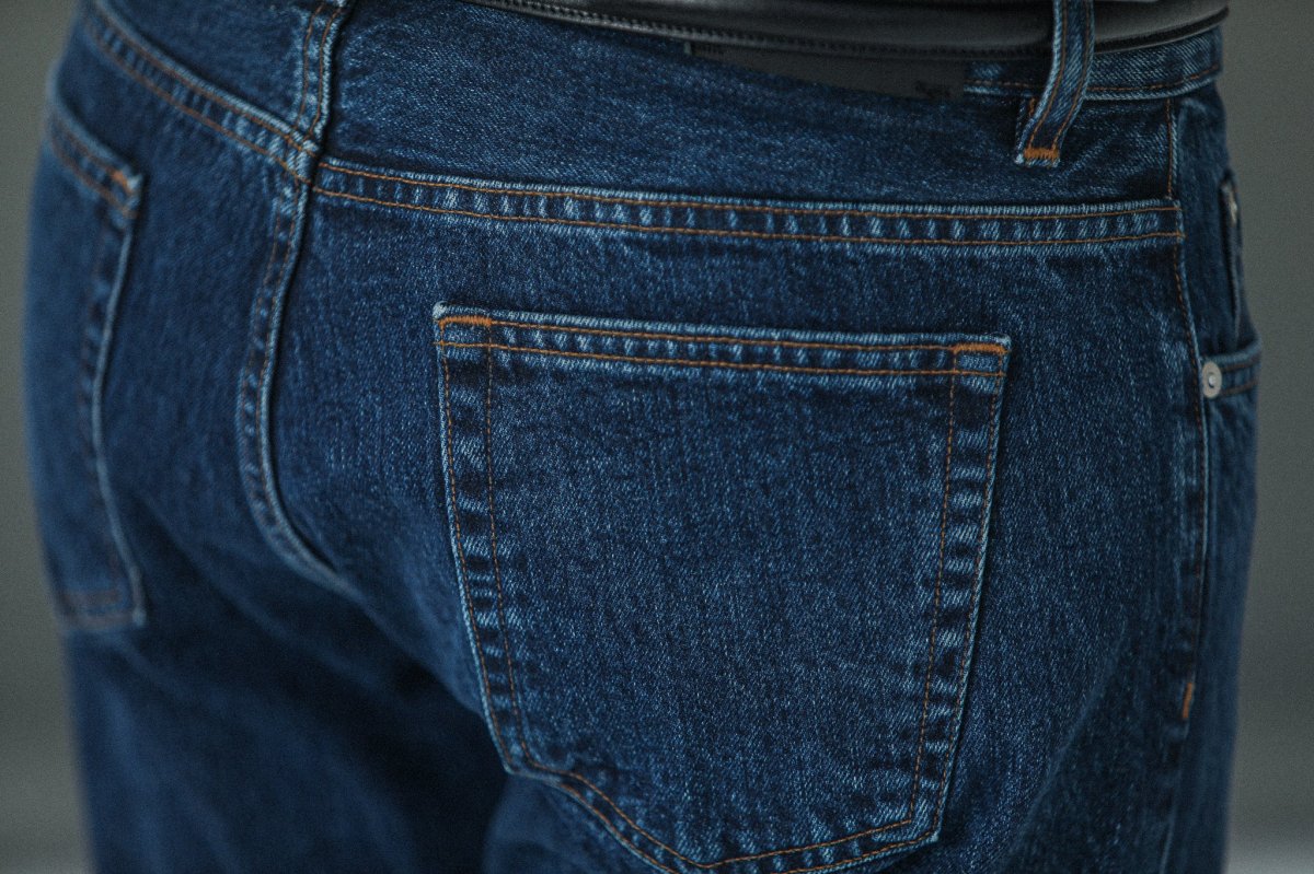 Nous avons décliné notre proposition de jeans dans une coupe « tapered », plus confortable. Cette pièce est confectionnée dans une très belle toile denim selvedge 14¾ oz épaisse à laquelle nous avons appliqué un délavage de type « stonewash » afin de l’assouplir et de révéler ses nuances d’indigo.