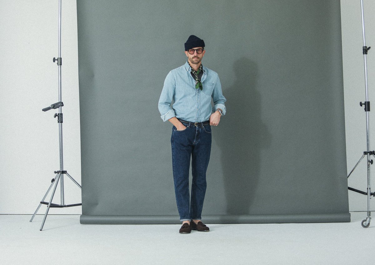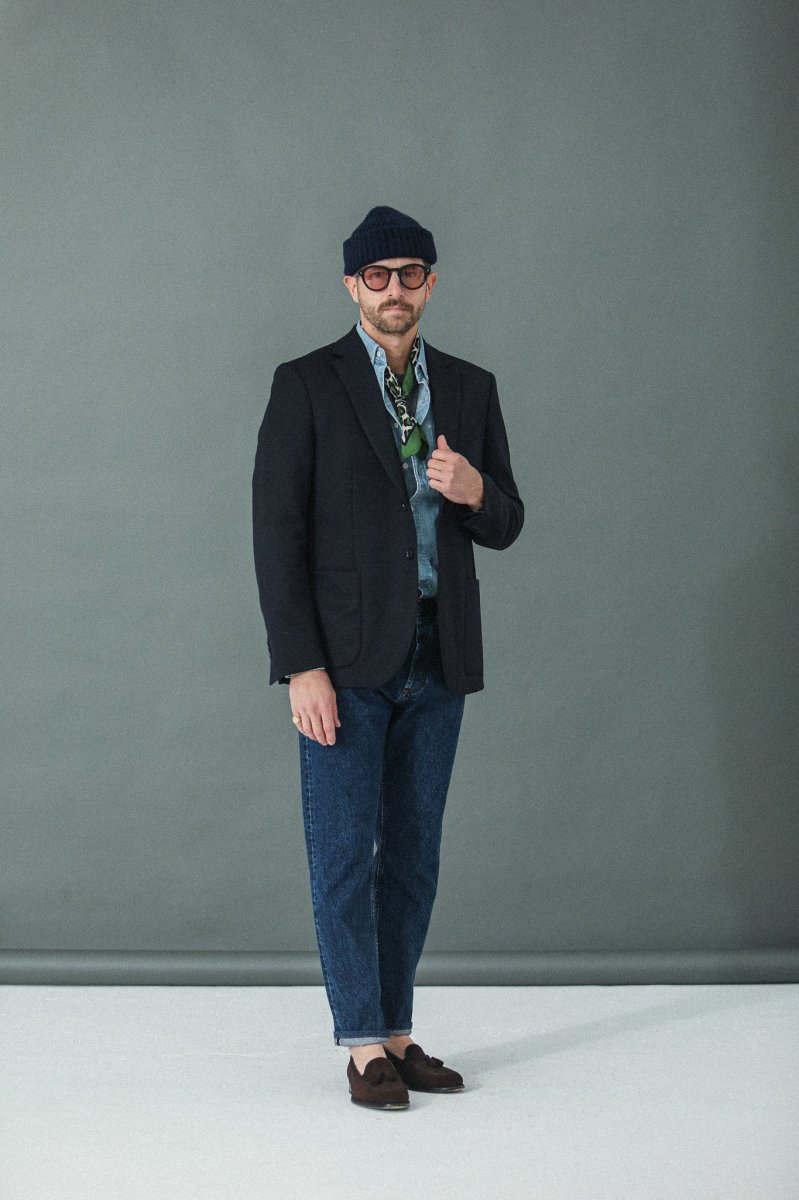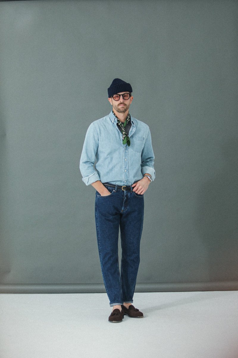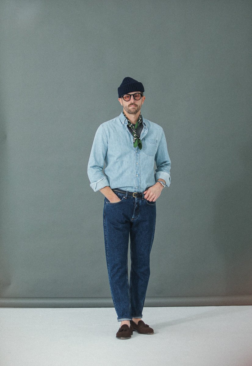 Nous avons décliné notre proposition de jeans dans une coupe « tapered », plus confortable. Cette pièce est confectionnée dans une très belle toile denim selvedge 14¾ oz épaisse à laquelle nous avons appliqué un délavage de type « stonewash » afin de l’assouplir et de révéler ses nuances d’indigo.