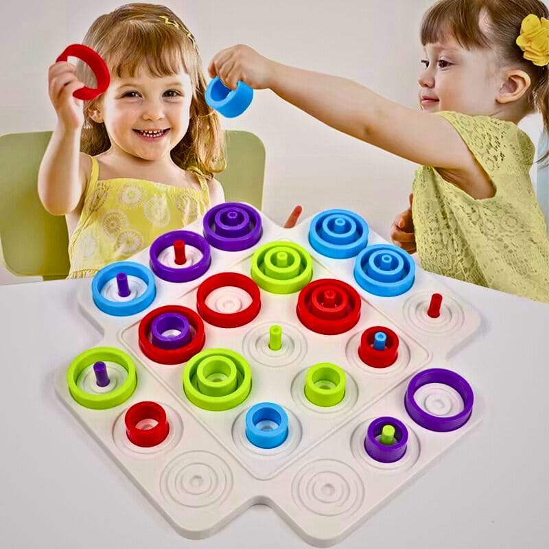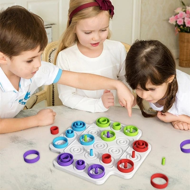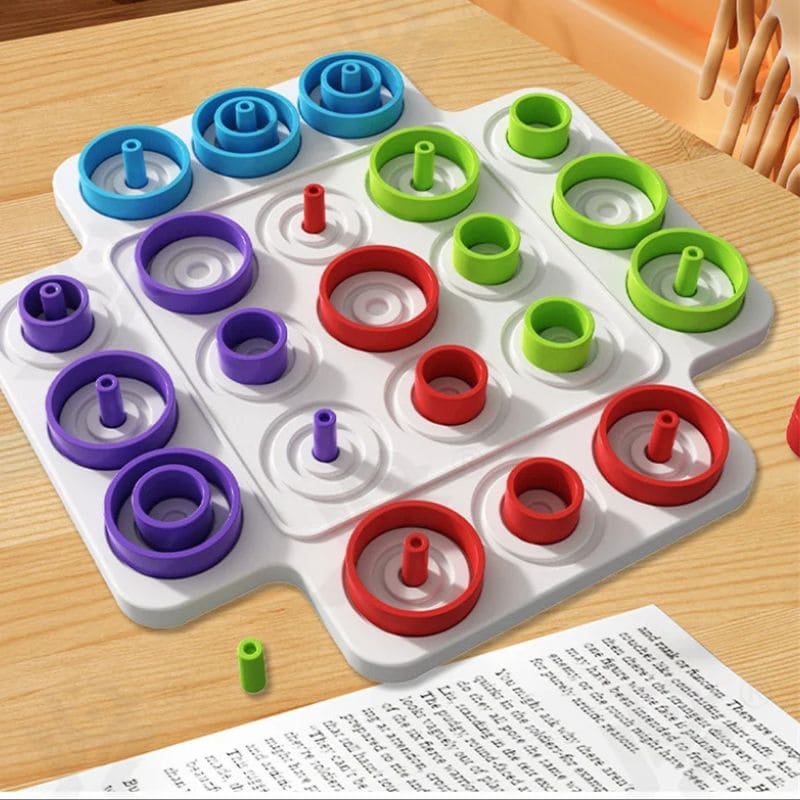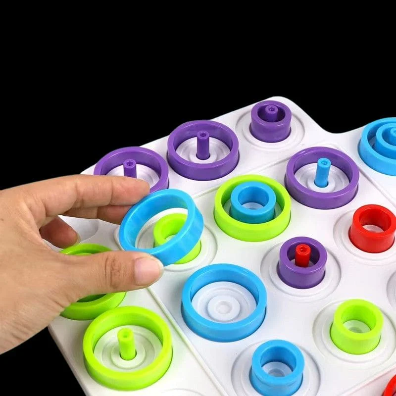 Ce jeu de stratégie reprend l’accessibilité du morpion et y ajoute une mécanique d’anneaux de trois tailles et multiples couleurs. Empilez, bloquez, contre-attaquez en pensant non seulement en 2 dimensions, mais aussi en hauteur.