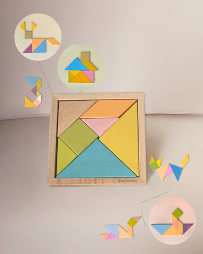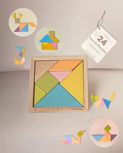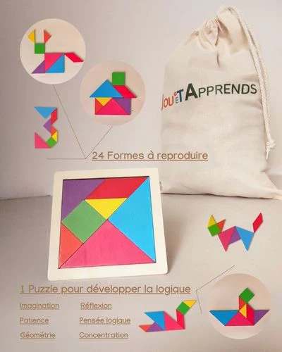 Jeu idéal pour profiter d’un temps calme. L’enfant peut jouer en autonomie ou à plusieurs. Très ludique car l’enfant s’amuse à reproduire les 24 formes proposées et même à développer et imaginer de nouvelles images à reproduire. Le puzzle tangram en bois est idéal pour allier intelligence, logique et amusement tout naturellement.