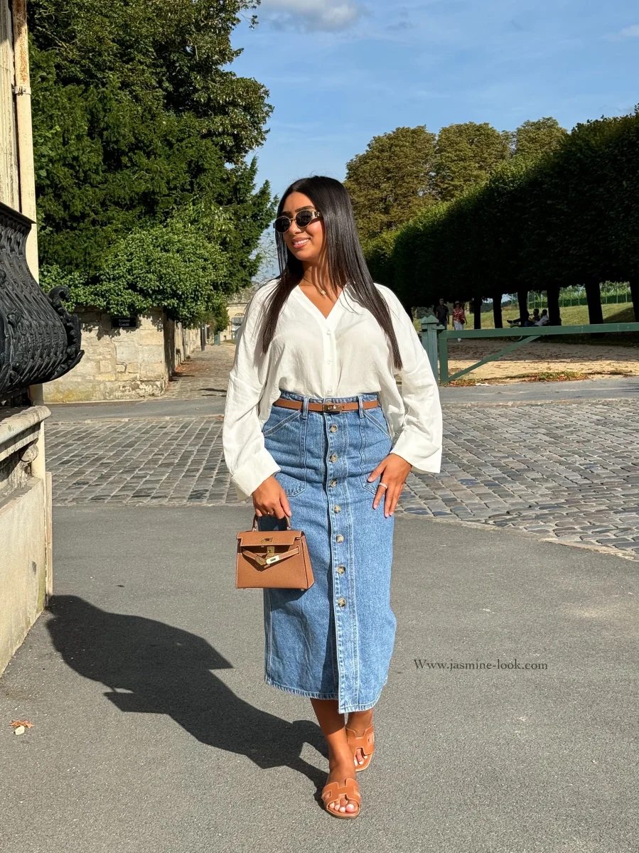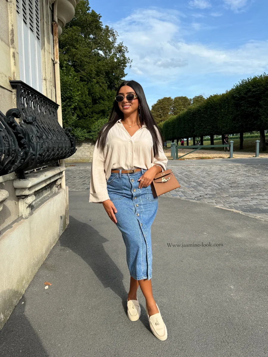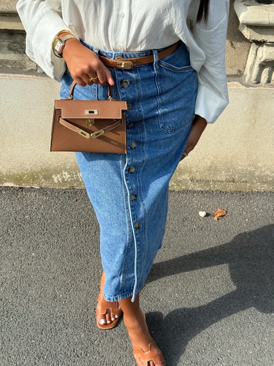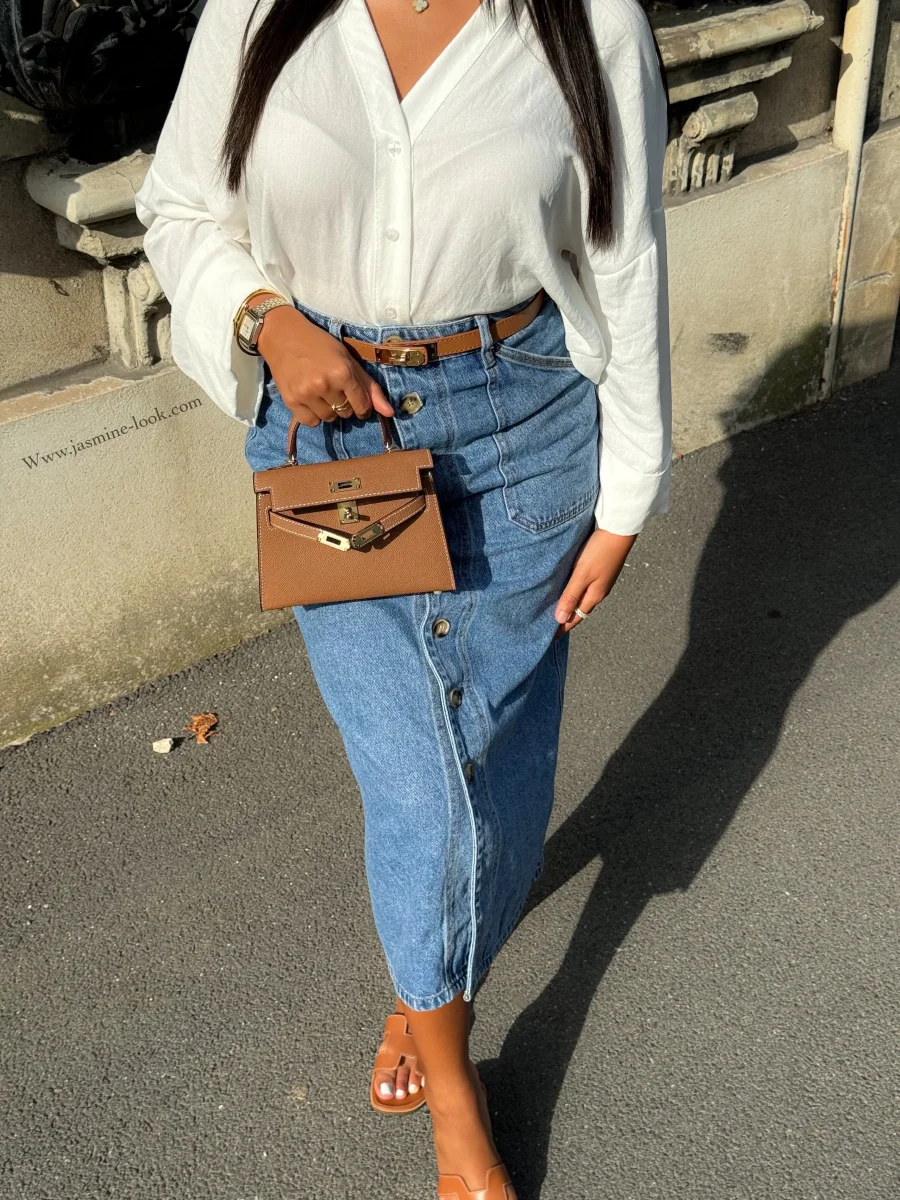 ⚜️Jupe boutonné taille haute , jean non strech ⚜️Taille correctement, entre 2 tailles nous recommandons la plus grande . La modèle mesure 1m64 et porte la taille M/38