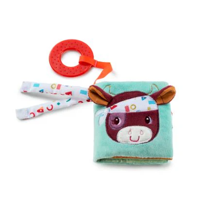 Livre jeu en tissu avec animaux de la ferme. Racontez des histoires pendant que votre enfant découvre les sons et les textures et laisse libre cours à son imagination. Avec anneau de dentition et papier bruit. dimension 9x10cm Pour les enfants à partir de 6 mois