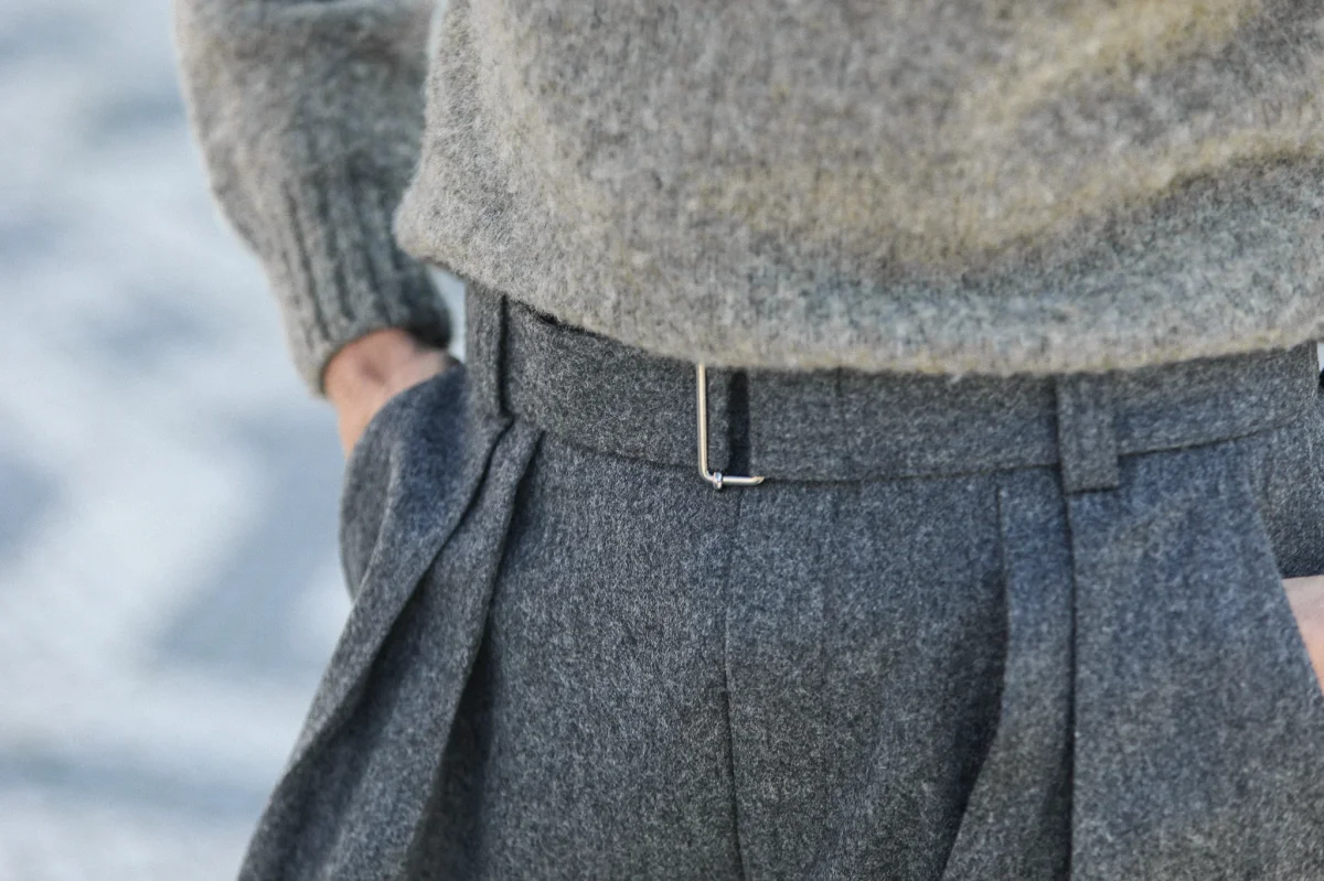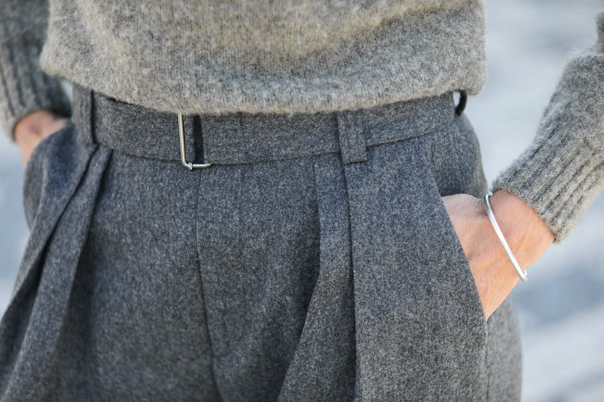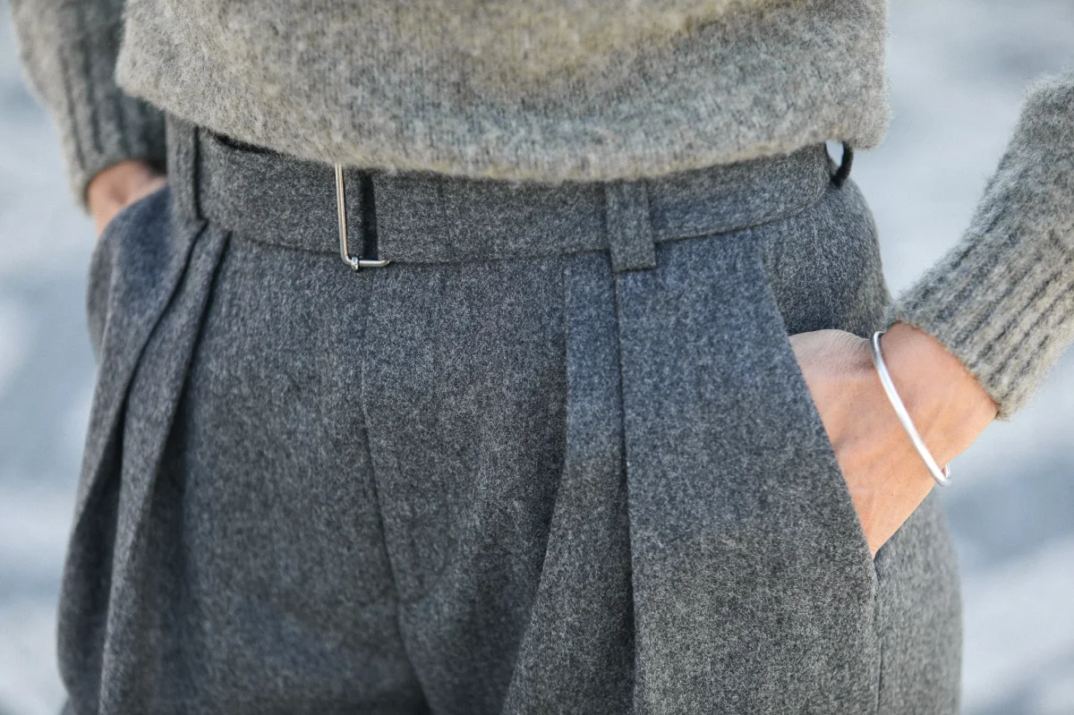 Pantalon taille haute confortable à double pince confectionné dans une magnifique flanelle de laine épaisse supersoft grise. La coupe Wide Leg comporte du volume aux niveaux des jambes et une ouverture large pour une silhouette fluide et contemporaine. Le pantalon est fini par un revers de 7 cms. La ceinture est amovible afin que vous puissiez porter celle de votre choix.
