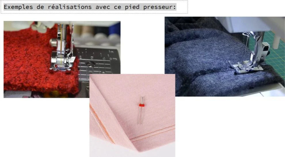 Venez découvrir ce pied destiné à des travaux de couture générale sur des matières tricotées, pour la couture de tricots, tissus en mailles type Jersey, cordons épais, paillettes, la surpiqûre de fils de laine, fils, cordons, bandes de cuir…