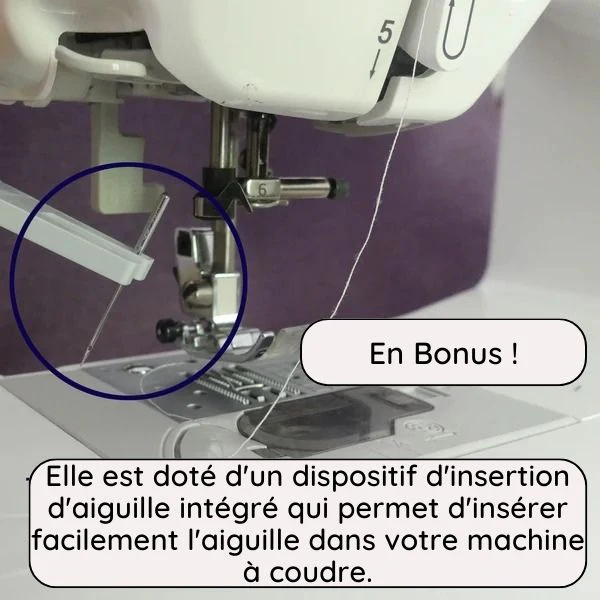 - est doté d’un dispositif d’insertion d’aiguille intégré qui permet d’insérer facilement l’aiguille dans votre machine à coudre.