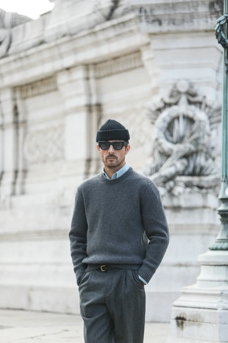 Pièce incontournable de nos collections d’hiver depuis plusieurs saisons, ce pull inspiré du vestiaire militaire, que nous avons choisi de confectionner dans une très belle laine d’agneau extra-fine d’origine italienne. Nous apprécions particulièrement le point « côtes anglaises » utilisé qui lui confère une allure structurée, dans le respect de son ADN.