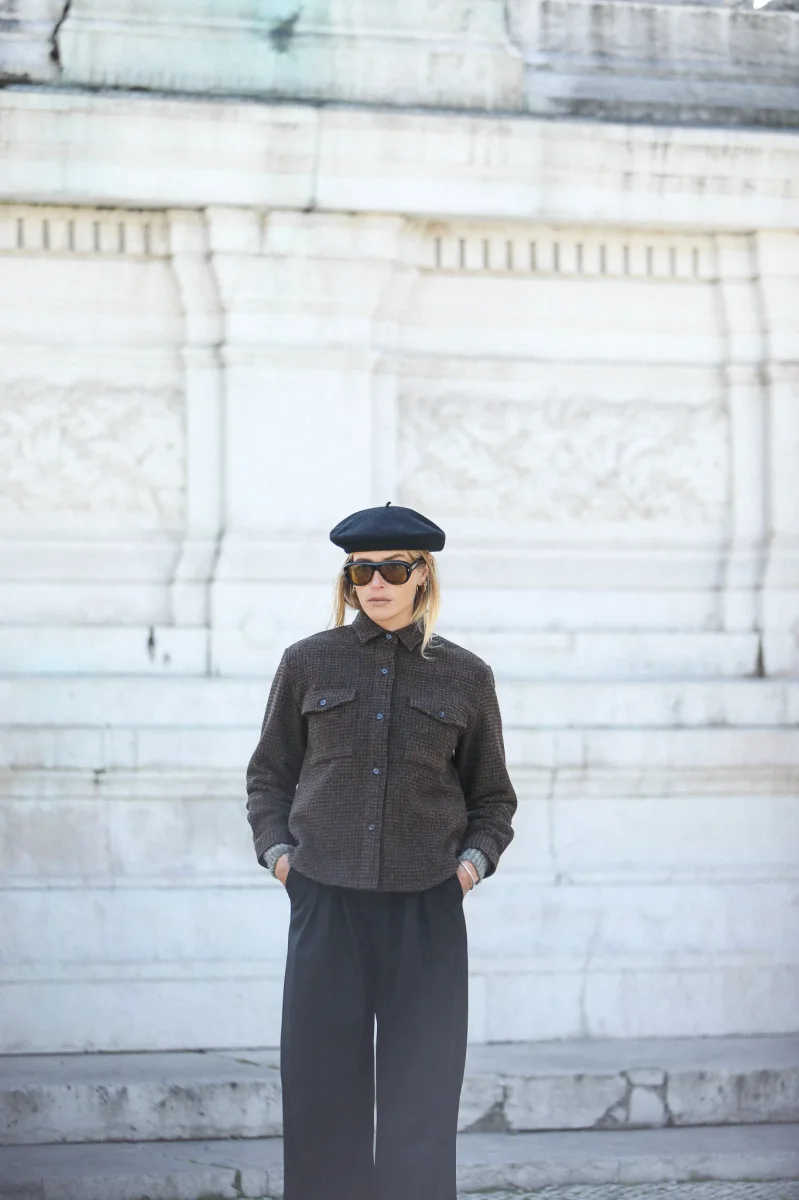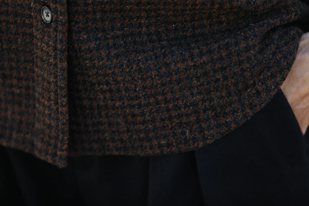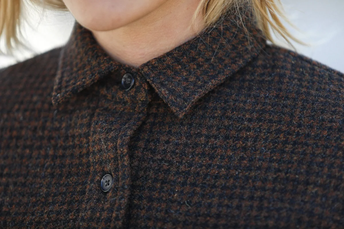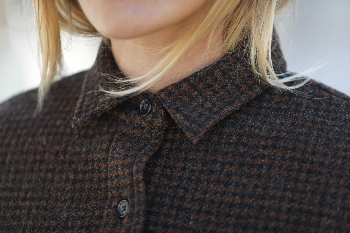 Surchemise d’inspiration militaire confectionnée dans une très belle laine à motif pied-de-poule en nuances de brun et doublée d’une toile de coton italien. Le finissage de la laine lui confère une très belle main, un peu rustique et rappele la main des tissus des tissus anciens. Vous pourrez également choisir de porter comme une veste.