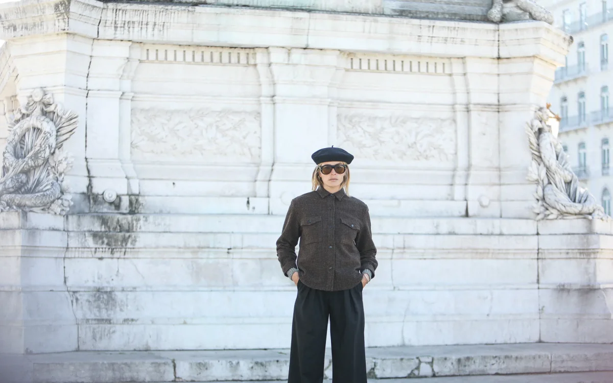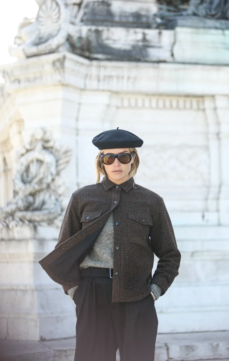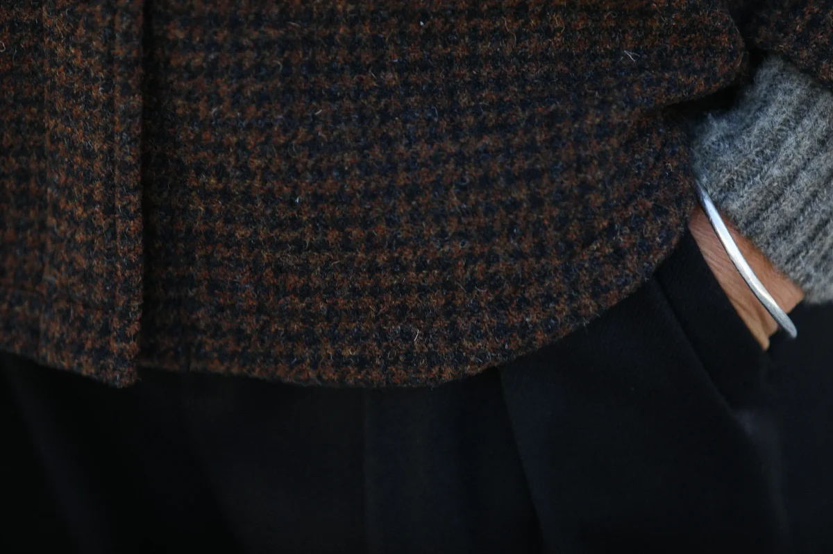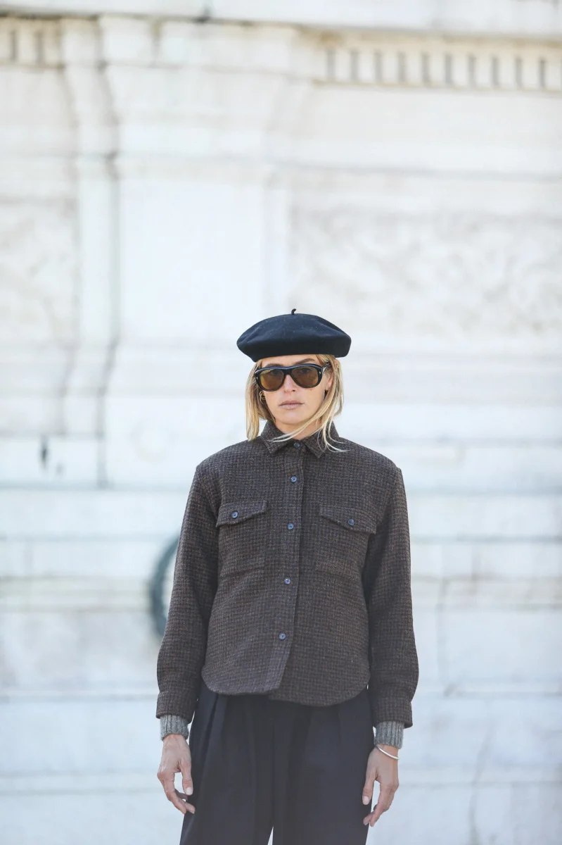Surchemise d’inspiration militaire confectionnée dans une très belle laine à motif pied-de-poule en nuances de brun et doublée d’une toile de coton italien. Le finissage de la laine lui confère une très belle main, un peu rustique et rappele la main des tissus des tissus anciens. Vous pourrez également choisir de porter comme une veste.