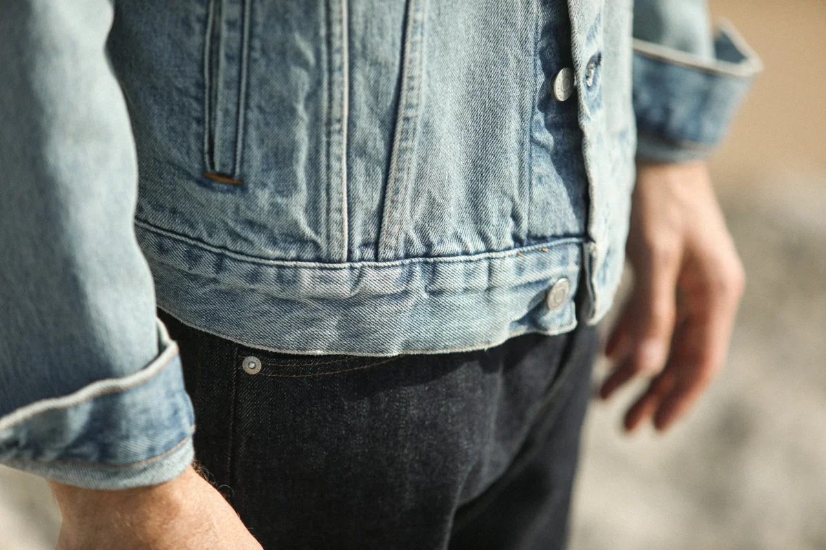 De retour cette saison dans une version un peu plus confortable, notre veste en jean de type « Trucker » confectionnée dans un très beau denim japonais délavé de la maison Kurabo. Il s’agit d’un hommage aux vestes en jean américaines iconiques des années 60, popularisées par Levi’s sous le nom de type « Trucker » ou « Type 3 ». Cette saison le fit a été revu pour un peu plus de confort au global.