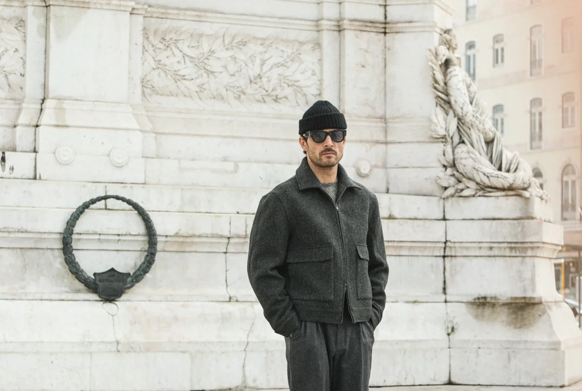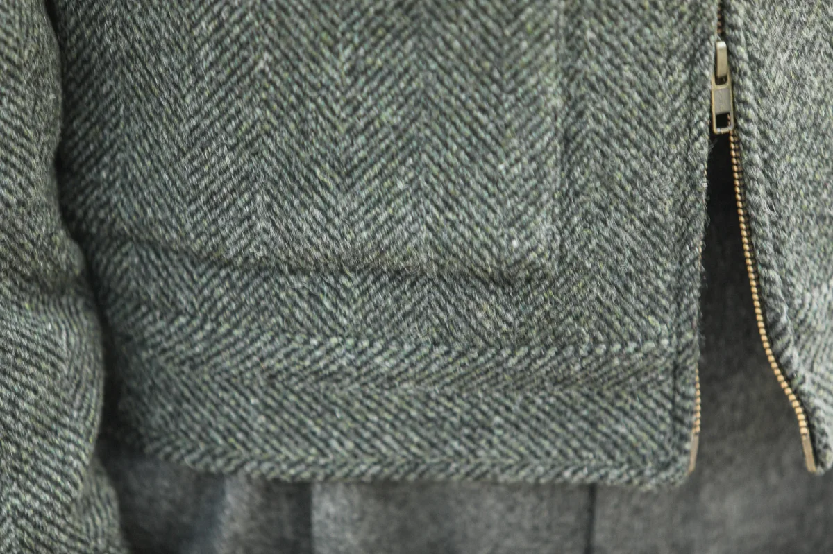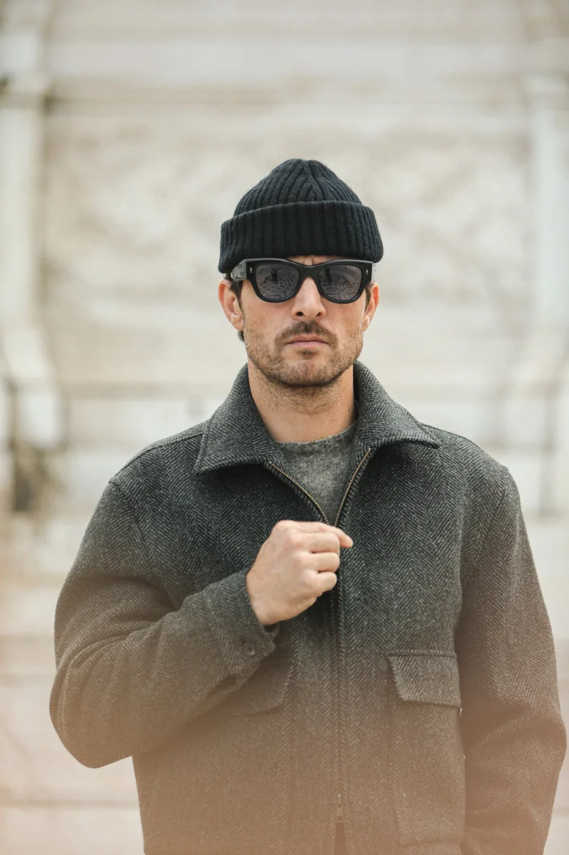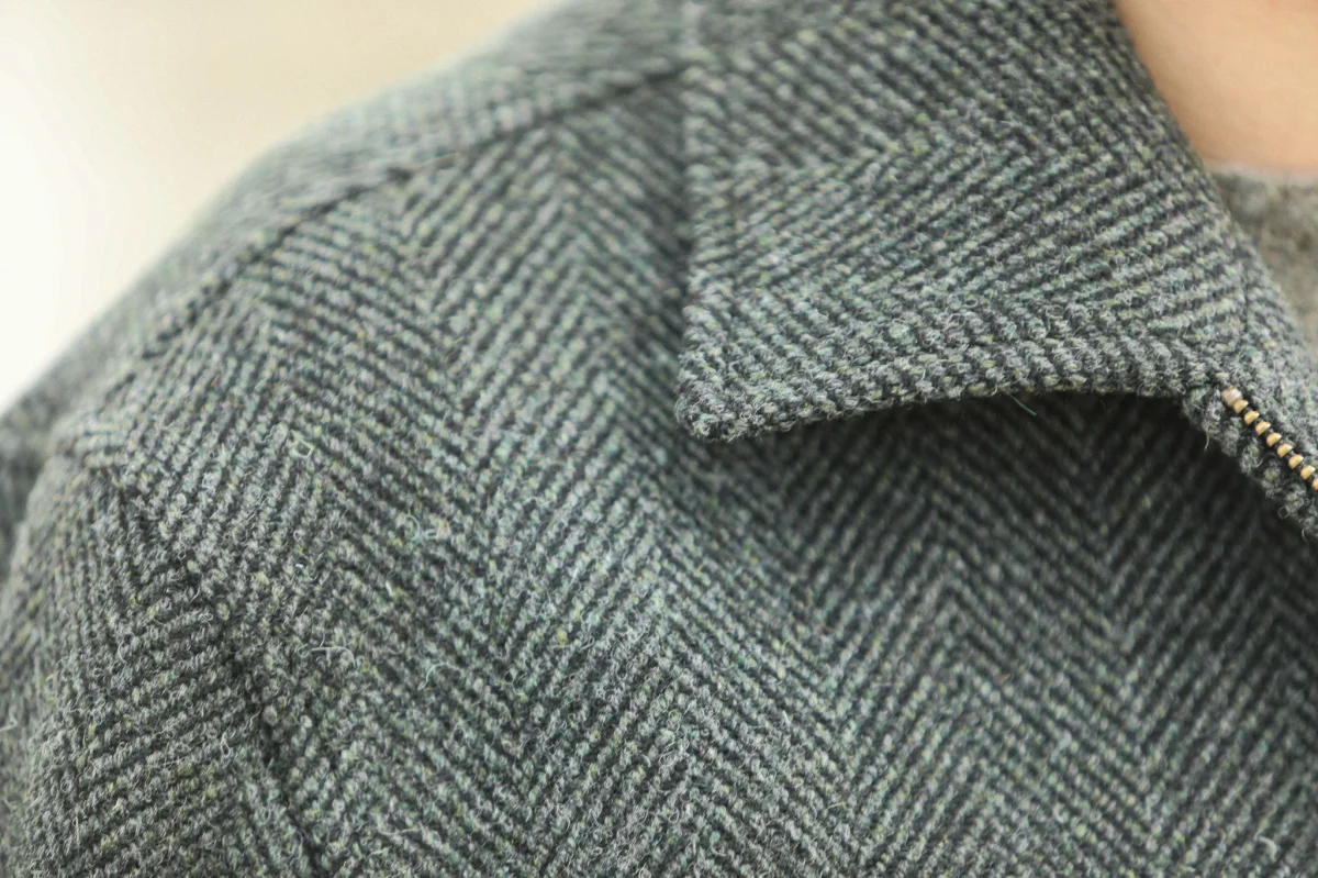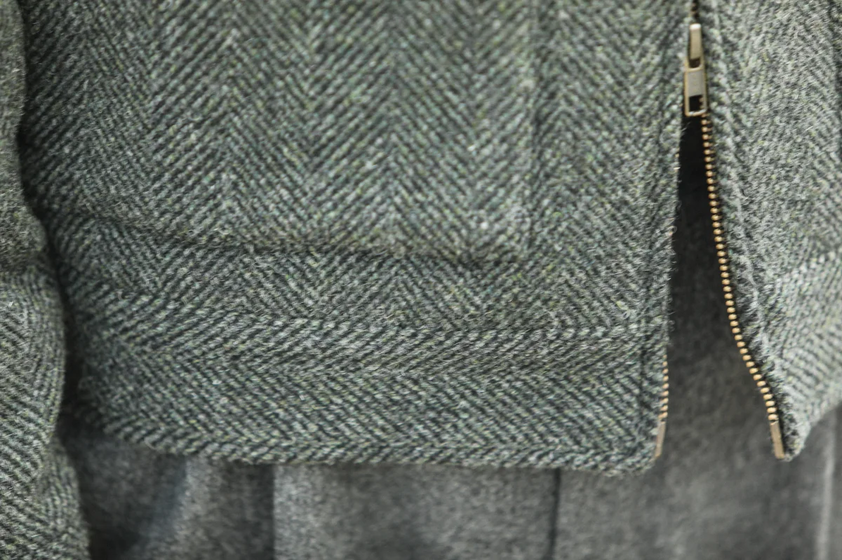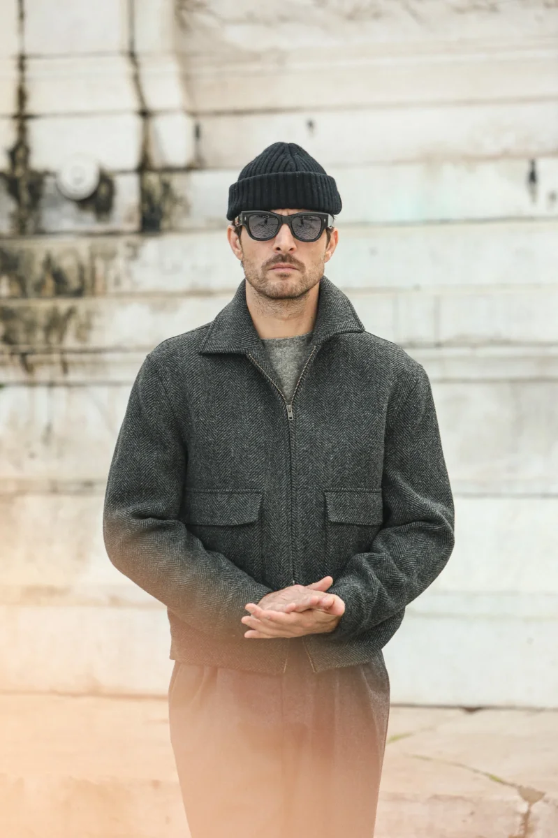 De retour cette saison, notre veste d’hiver déclinée dans une version « Aviator » avec de larges poches frontales plaquées inspirées du vestiaire militaire. Le tissu est un magnifique drap italien pure laine à chevrons en nuances de vert/khaki à l’aspect robuste mais très agréable à porter. Un col simple et une double fermeture à glissière terminent cette pièce.