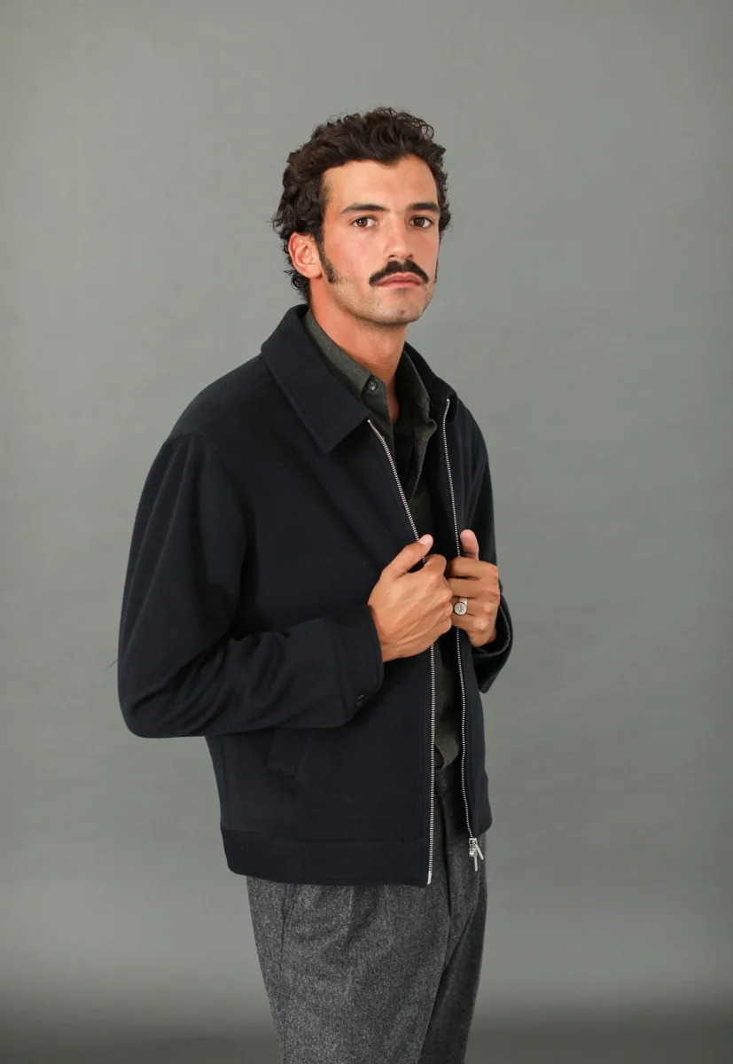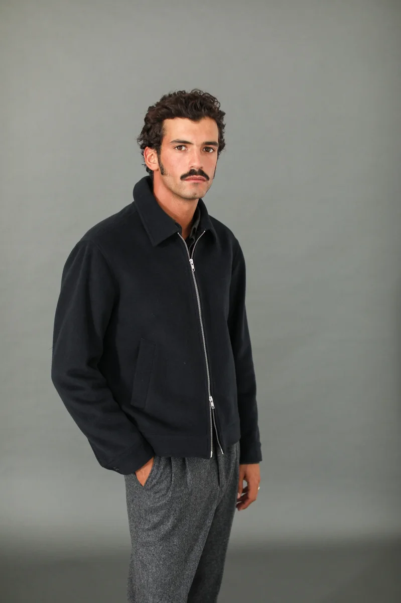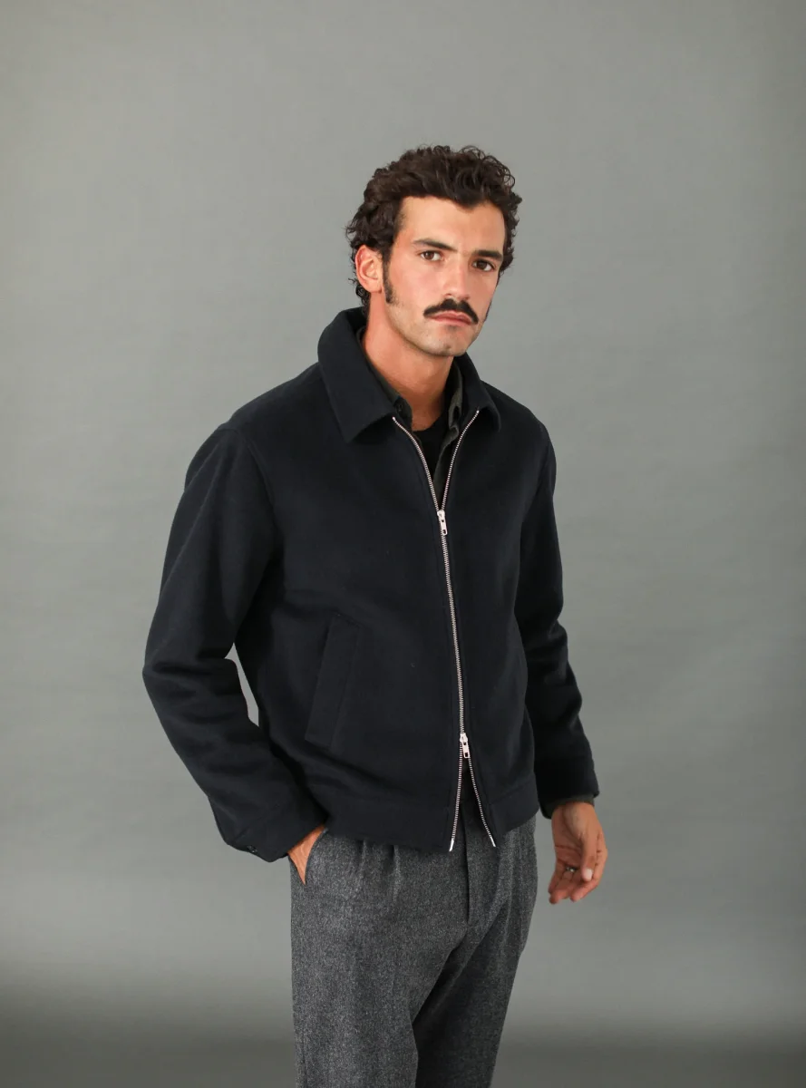 Veste en laine à fermeture Éclair. Le col simple termine une pièce que nous sommes fiers de vous proposer depuis l’hiver dernier : un mélange laine et cachemire d’origine italienne, une double fermeture à glissière sobre et deux poches obliques.