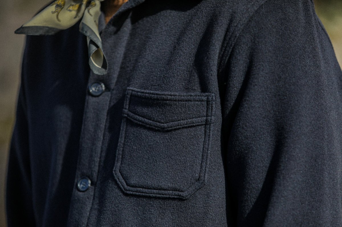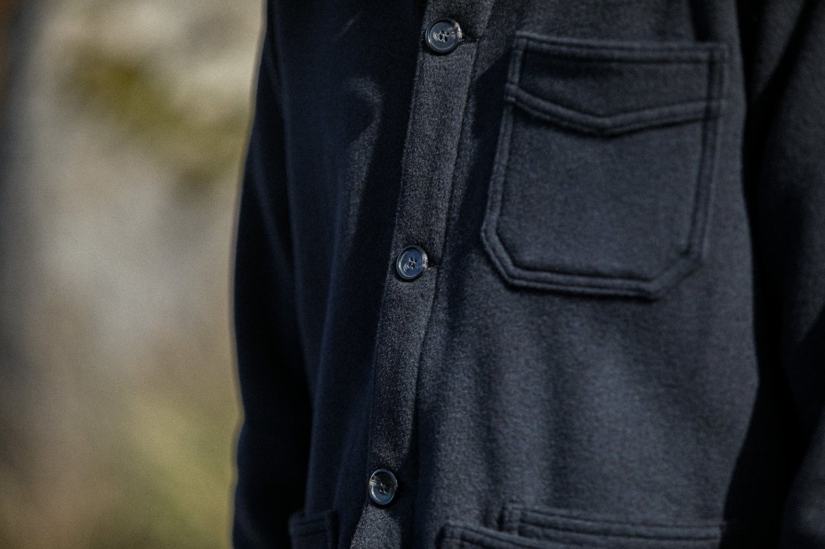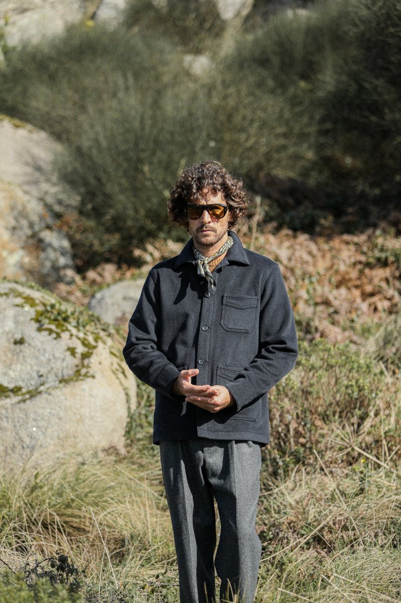 Veste de type « Chore Jacket » inspirée des vêtements de travail. Déclinaison hivernale de nos vestes workers d’été, confectionnée dans un très beau drap italien en Laine & Cachemire. Un tissu épais mais souple à la main et au finissage luxueux.