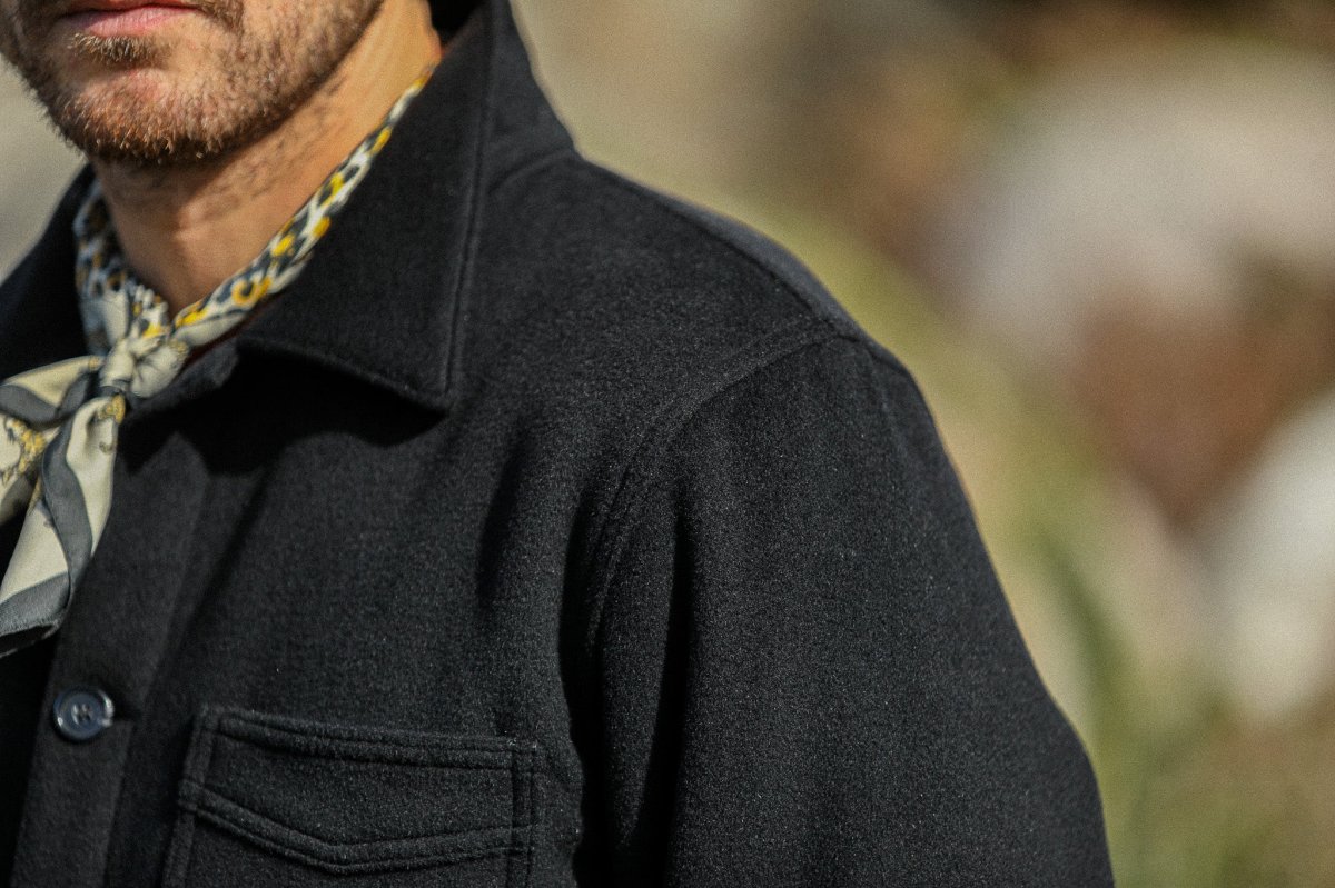 Veste de type « Chore Jacket » inspirée des vêtements de travail. Déclinaison hivernale de nos worker d’été, confectionnée dans un très beau drap italien Laine & Cachemire. Un tissu épais mais souple à la main et au finissage luxueux.